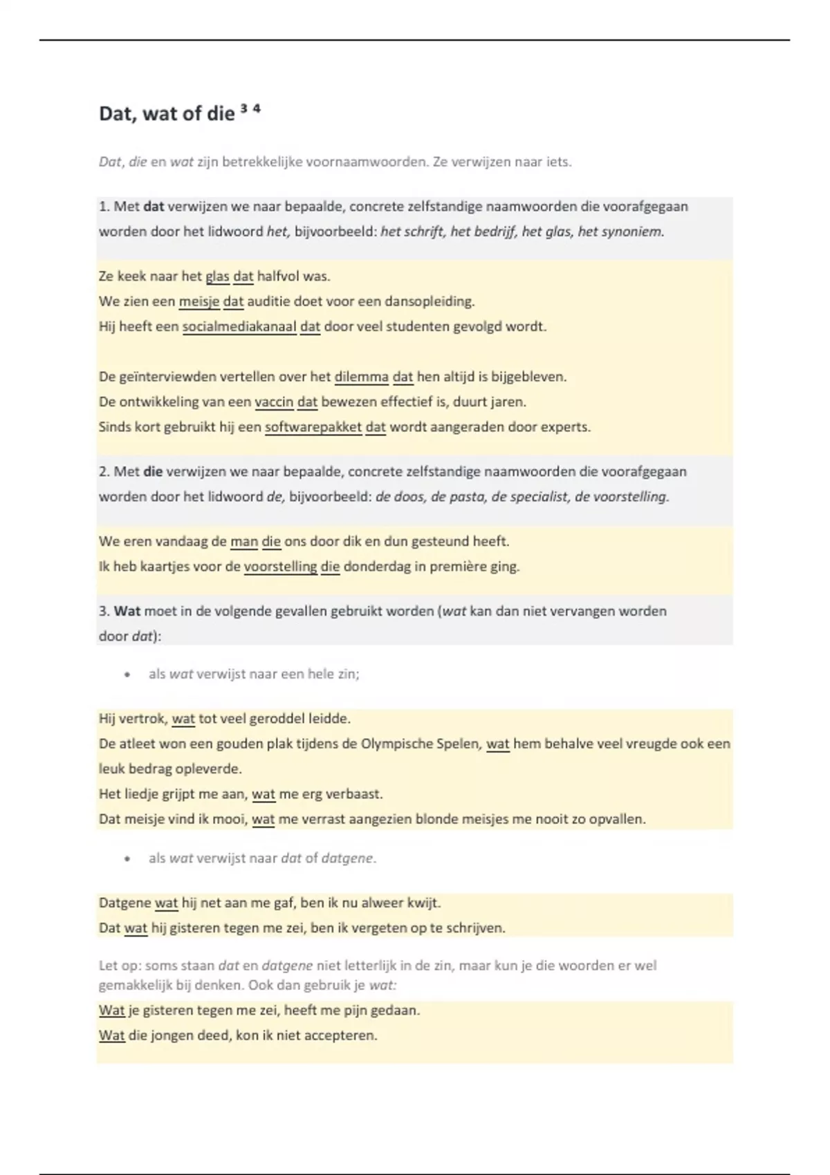 Dat, die en wat zijn betrekkelijke voornaamwoorden. Ze verwijzen naar iets.