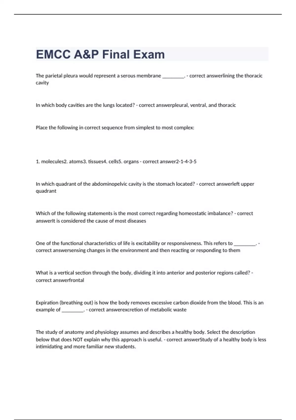 The parietal pleura would represent a serous membrane ________. - correct answerlining the thoracic cavity In which body cavities are the lungs located? - correct answerpleural, ventral, and thoracic Place the following in correct sequence from simplest to most complex: 1. molecules2. atoms3. tissues4. cells5. organs - correct answer2-1-4-3-5 In which quadrant of the abdominopelvic cavity is the stomach located? - correct answerleft upper quadrant Which of the following statements is the most correct regarding homeostatic imbalance? - correct answerIt is considered the cause of most diseases One of the functional characteristics of life is excitability or responsiveness. This refers to ________. - correct answersensing changes in the environment and then reacting or responding to them What is a vertical section through the body, dividing it into anterior and posterior regions called? - correct answerfrontal Expiration (breathing out) is how the body removes excessive carbon dioxide from the blood. This is an example of ________. - correct answerexcretion of metabolic waste The study of anatomy and physiology assumes and describes a healthy body. Select the description below that does NOT explain why this approach is useful. - correct answerStudy of a healthy body is less intimidating and more familiar new students. One of the descriptions below is from the perspective of anatomical study, the rest are from a physiological perspective. Select the description below that comes from an anatomical perspective. - correct answerThe innermost lining of the lungs is composed primarily of a thin tissue called simple squamous epithelium. Which of the following is the best explanation for why cells are considered the smallest units of living things. - correct answerCells are the simplest structure to fit all of the characteristic necessary to be considered alive. Positive feedback differs from negative feedback because ________. - correct answerpositive feedback tends to enhance the triggering stimulus while negative feedback tends to return the body to a homeostatic balance or "ideal" le