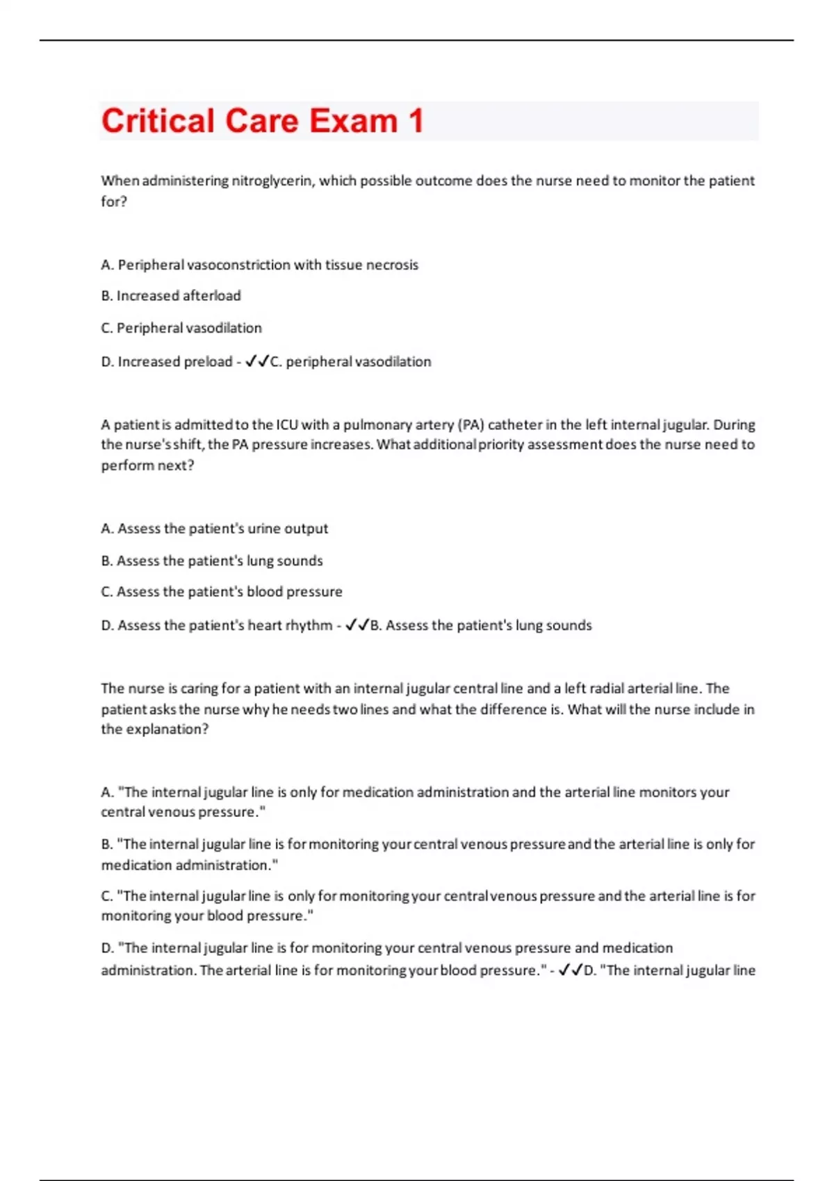 When administering nitroglycerin, which possible outcome does the nurse need to monitor the patient for? A. Peripheral vasoconstriction with tissue necrosis B. Increased afterload C. Peripheral vasodilation D. Increased preload - C. peripheral vasodilation A patient is admitted to the ICU with a pulmonary artery (PA) catheter in the left internal jugular. During the nurse's shift, the PA pressure increases. What additional priority assessment does the nurse need to perform next? A. Assess the patient's urine output B. Assess the patient's lung sounds C. Assess the patient's blood pressure D. Assess the patient's heart rhythm - B. Assess the patient's lung sounds The nurse is caring for a patient with an internal jugular central line and a left radial arterial line. The patient asks the nurse why he needs two lines and what the difference is. What will the nurse include in the explanation? A. "The internal jugular line is only for medication administration and the arterial line monitors your central venous pressure." B. "The internal jugular line is for monitoring your central venous pressure and the arterial line is only for medication administration." C. "The internal jugular line is only for monitoring your central venous pressure and the arterial line is for monitoring your blood pressure." D. "The internal jugular line is for monitoring your central venous pressure and medication administration. The arterial line is for monitoring your blood pressure." - D. "The internal jugular lineis for monitoring your central venous pressure and medication administration. The arterial line is for monitoring your blood pressure." The nurse observes asystole on the patient's telemetry monitor. What is the nurse first action? A. Carry out defibrillation. B. Notify the physician. C. Assess the patient. D. Administer atropine IV. - C. Assess the patient.