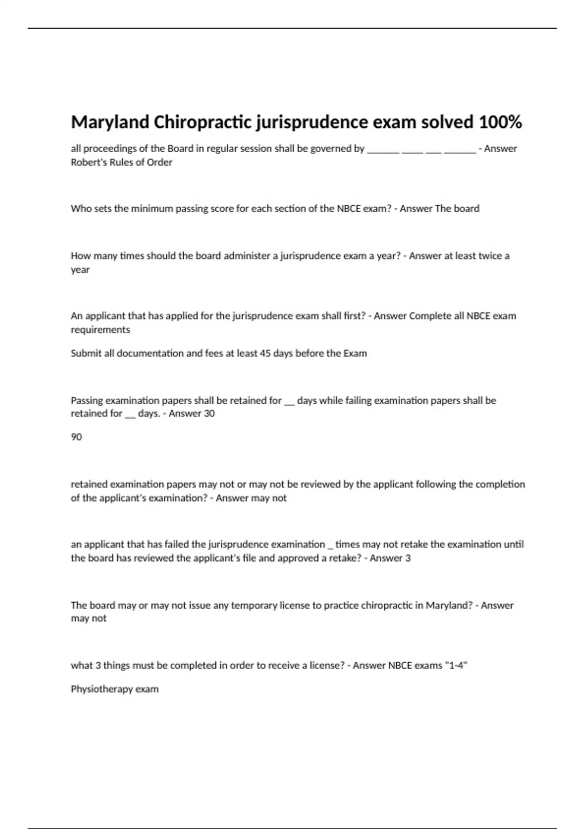 all proceedings of the Board in regular session shall be governed by ______ ____ ___ ______ - Answer Robert's Rules of Order Who sets the minimum passing score for each section of the NBCE exam? - Answer The board How many times should the board administer a jurisprudence exam a year? - Answer at least twice a year An applicant that has applied for the jurisprudence exam shall first? - Answer Complete all NBCE exam requirements Submit all documentation and fees at least 45 days before the Exam Passing examination papers shall be retained for __ days while failing examination papers shall be retained for __ days. - Answer 30 90 retained examination papers may not or may not be reviewed by the applicant following the completion of the applicant's examination? - Answer may not an applicant that has failed the jurisprudence examination _ times may not retake the examination until the board has reviewed the applicant's file and approved a retake? - Answer 3 The board may or may not issue any temporary license to practice chiropractic in Maryland? - Answer may not what 3 things must be completed in order to receive a license? - Answer NBCE exams "1-4" Physiotherapy exam jurisprudence exam a license must be displayed at the practice and the license holder shall notify the Board of any change in the name or address of the license holder in writing - Answer 60 an applicant for reinstatement of a license that has lapsed for a period of more than __ ___ shall be admitted only after satisfying the Board as to the applicant's efficiency by examination and the payment of fees due? - Answer 2 years the board shall give _ licenses which are? - Answer 2 licenses an license covering the practice of chiropractic and physical therapy a license permitting the holder to practice chiropractic if a doctor with a chiropractic license wishes to practice physical therapy they have to pass the NBCE physiotherapy exam with a minimum score of __?? - Answer 75% All motions filed by a party with the Board or the Office of Administrative Hearings, as appropriate, shall be accompanied by a memorandum of points and authorities shall be filed at least __ days before the hearing. A copy shall be served on the opposing party. any response shall be filed with the Board or the Office of Administrative Hearings, as appropriate, at least __ days before the hearing and a copy shall be served on the opposing party? - Answer 15 7 Discovery on request. By written request served on the other party and filed with the Board or the Office of Administrative Hearings, as appropriate, a party may require another party to produce within __ days a? - Answer 15 days a list of witnesses to be called copies of documents intended to be produced at the hearing Mandatory discovery. each party shall provide to the other party? not later than _ days before the preheating conference, if scheduled, or __ days before the scheduled hearing date. whichever is first - Answer the name and curriculum of any expert witness who will testify and a detailed report summarizing the expert's testimony which includes the opinion offered and the factual basis and reasons underlying the opinion 15 days 45 days the only way to add items to the hearing is through? - Answer discovery on request mandatory discovery Duties of President Officer. The board shall conduct hearings before a quorum of the Board. _____ board members present and entitled to vote shall constitute a quorum. Board action shall be by ____ vote of all the members tiger serving. - Answer 4 majority what is the order of procedure when conducting a hearing? who speaks first - Answer the state shall present its case first. Then the respondent shall present his case. After this the state may present a rebuttal who may the presiding officer or the presiding officer's designee examine at the hearing? - Answer a witness called by a party an individual in attendance at the hearing A member of the board may examine ____ called by a party? - Answer witness every decision and order rendered by the board shall be in writing and shall be accompanied by finding of fact and conclusions of law? T or F? - Answer true