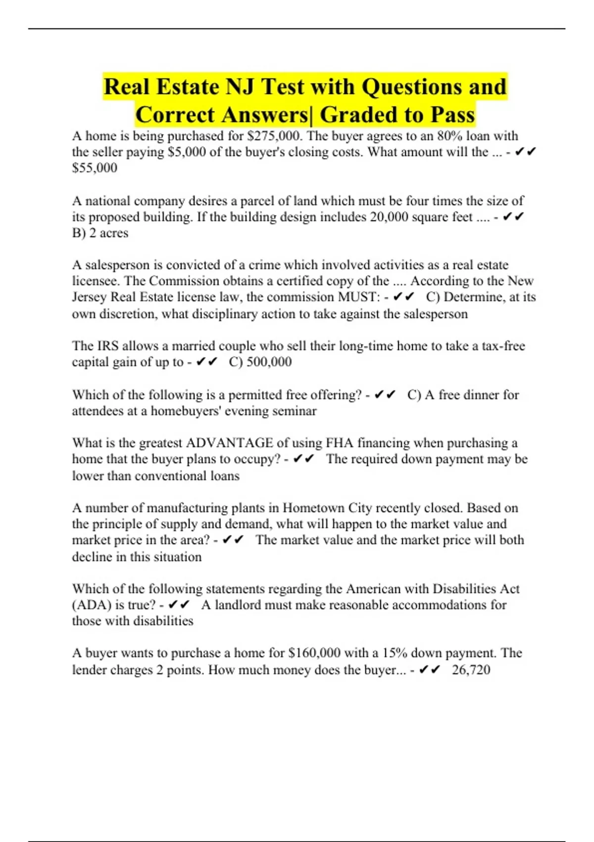 Real Estate NJ Test with Questions and Correct Answers| Graded to Pass