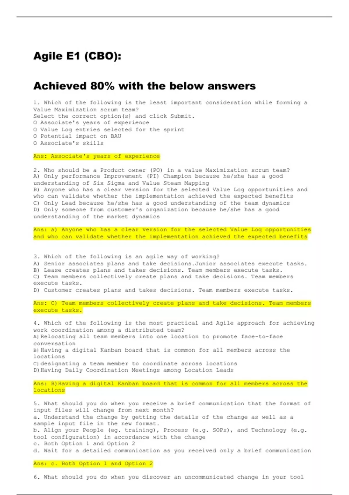 Agile E1 (CBO): Achieved 80% with the below answers
