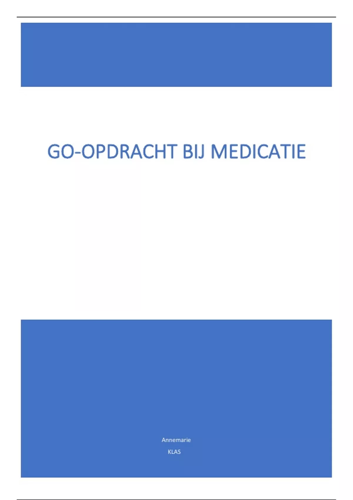 Het bestaat uit twee opdrachten. In de eerste opdracht heb ik drie medicijnen volledig uitgeschreven, Oxazepam, Rivastigmine pleister en Clozapine. Hierin staat uitgeschreven wat de werking is, veel voorkomende bijwerkingen, bijzonderheden bij toediening, dosering, wat te doen bij over of onder dosering en wisselwerking. Bij de tweede opdracht heb ik uitgeschreven hoe de medicatie binnen komt, gecontroleerd, bewaard en gegeven wordt, waar rekening mee houden en wat te doen bij medicatiefouten. Deze go opdracht heb ik afgerond met een 9
