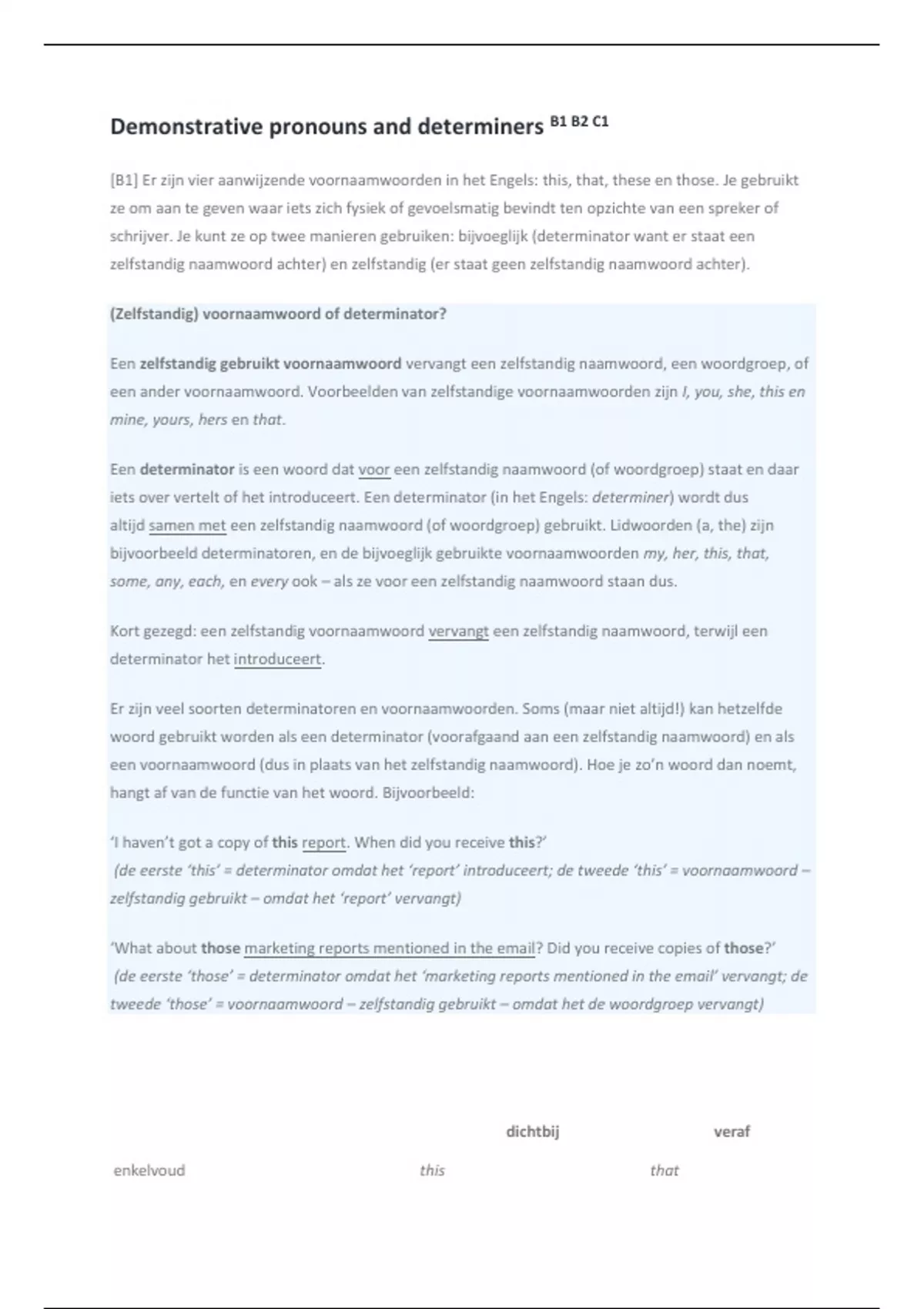 Samenvatting Demonstrative pronouns and determiners (Hogeschooltaal Engels)