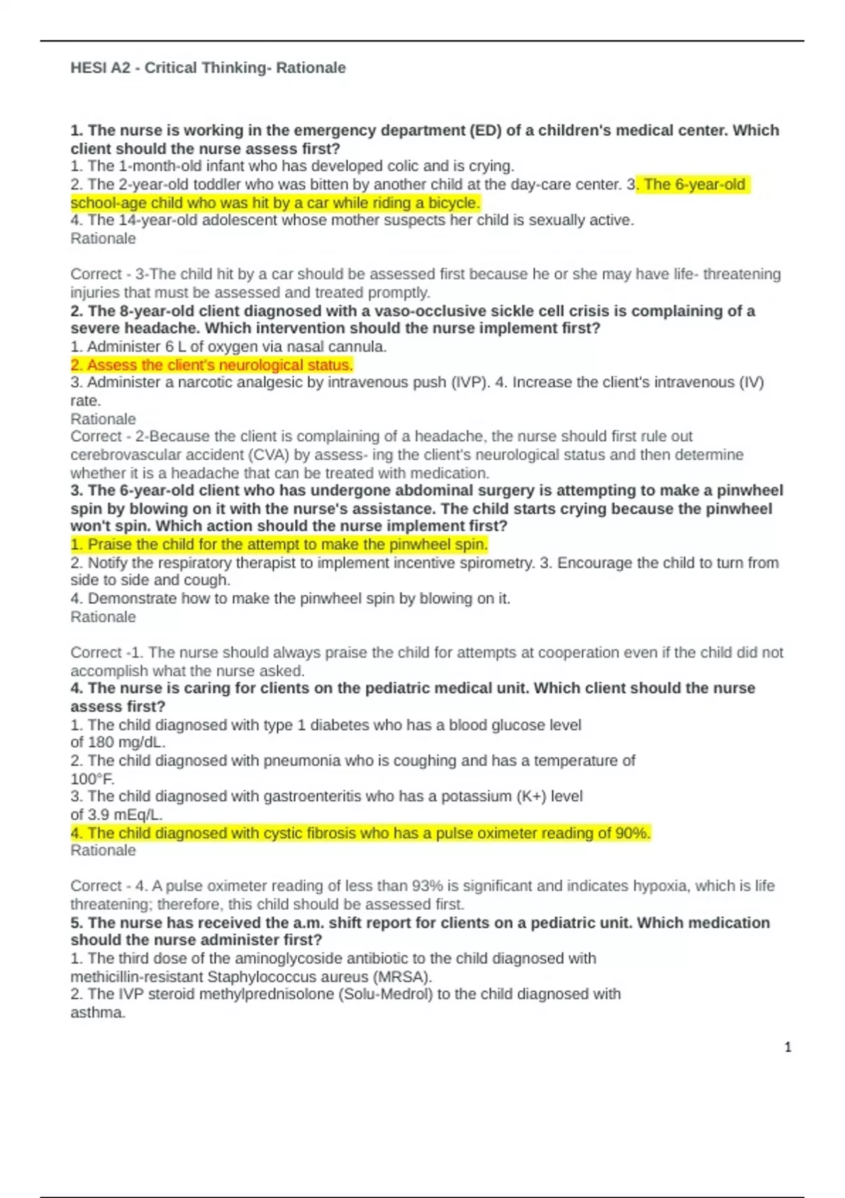 HESI A2 Critical Thinking Questions And Answers with Rationale
