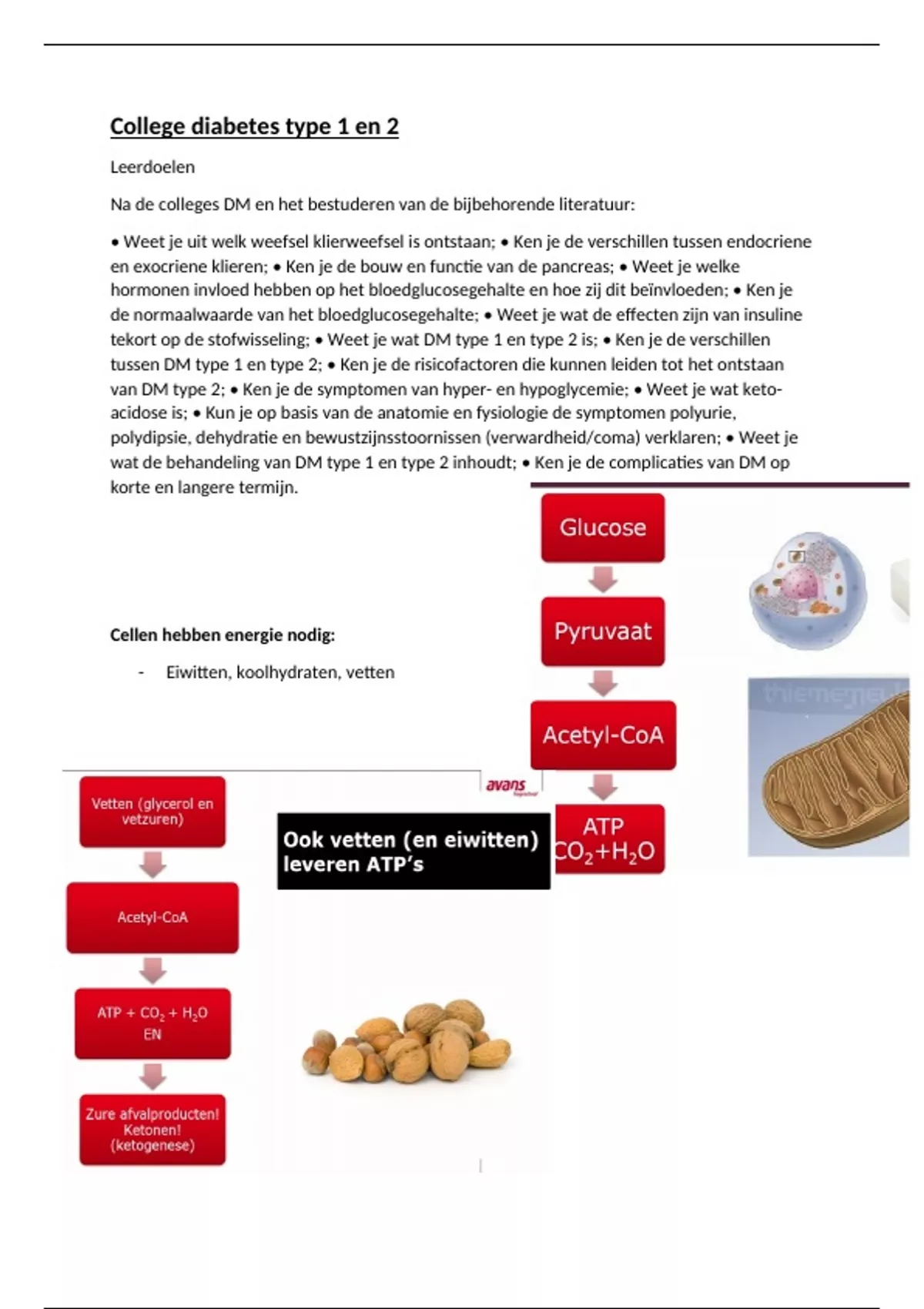 In dit document wordt compact de basis van diabetes type 1 en type 2 omschreven. De bouw en functies van de pancreas worden afgebeeld. De hormonen die te maken hebben met de glucosespiegel worden uitgelegd. Ook staan in dit document de gevolgen van diabetes mellitus op korte en lange termijn.