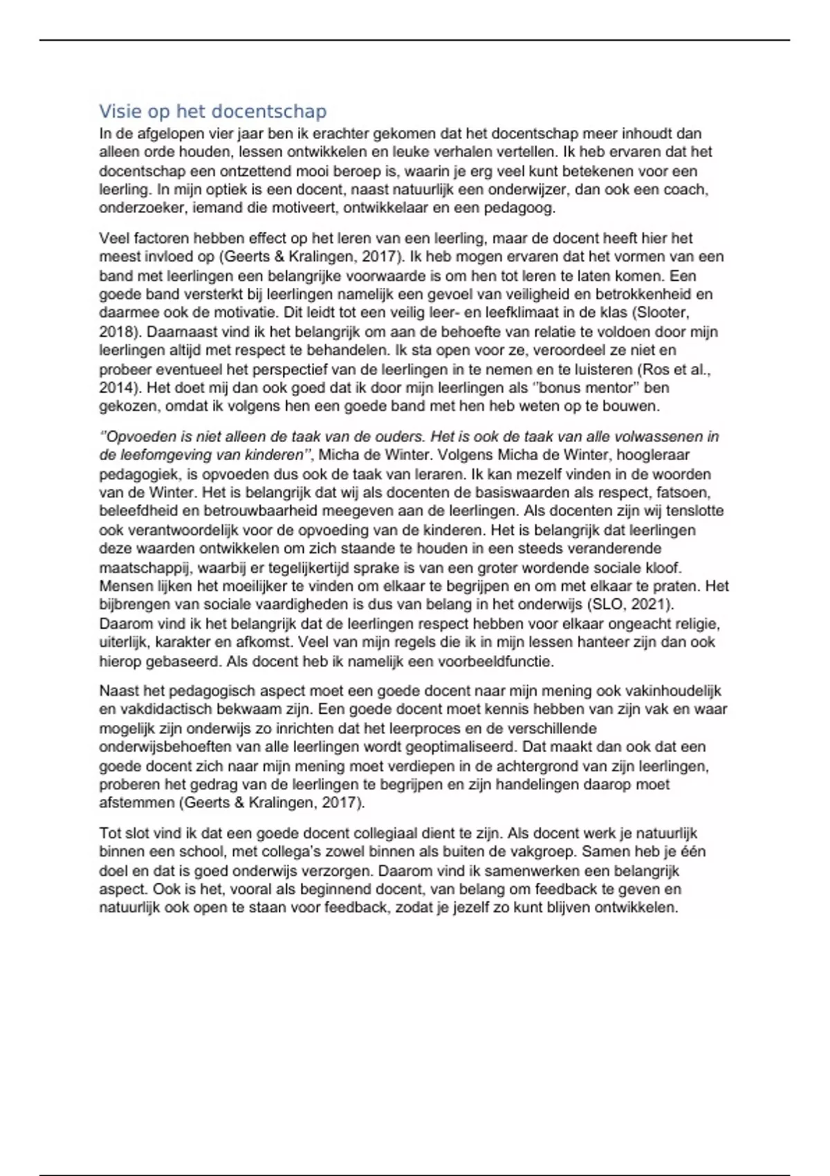 pedagogiek, is opvoeden dus ook de taak van leraren. Ik kan mezelf vinden in de woorden