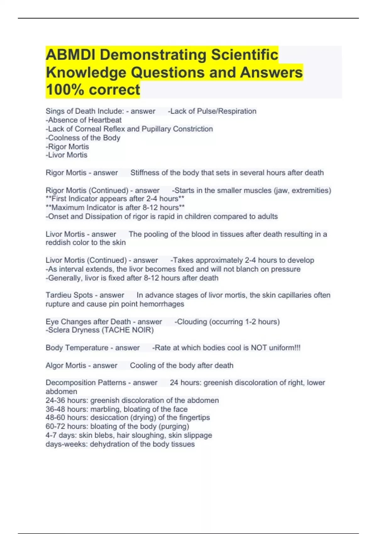 ABMDI Demonstrating Scientific Knowledge Questions and Answers 100% correct Sings of Death Include: -Lack of Pulse/Respiration -Absence of Heartbeat -Lack of Corneal Reflex and Pupillary Constriction -Coolness of the Body -Rigor Mortis -Livor Mortis Rigor Mortis Stiffness of the body that sets in several hours after death Rigor Mortis (Continued) -Starts in the smaller muscles (jaw, extremities) *First Indicator appears after 2-4 hours* *Maximum Indicator is after 8-12 hours* -Onset and Dissipation of rigor is rapid in children compared to adults Livor Mortis The pooling of the blood in tissues after death resulting in a reddish color to the skin Livor Mortis (Continued) -Takes approximately 2-4 hours to develop -As interval extends, the livor becomes fixed and will not blanch on pressure -Generally, livor is fixed after 8-12 hours after death Tardieu Spots In advance stages of livor mortis, the skin capillaries often rupture and cause pin point hemorrhages Eye Changes after Death -Clouding (occurring 1-2 hours) -Sclera Dryness (TACHE NOIR) Body Temperature -Rate at which bodies cool is NOT uniform!!! Algor Mortis Cooling of the body after death Decomposition Patterns 24 hours: greenish discoloration of right, lower abdomen 24-36 hours: greenish discoloration of the abdomen 36-48 hours: marbling, bloating of the face 48-60 hours: desiccation (drying) of the fingertips 60-72 hours: bloating of the body (purging) 4-7 days: skin blebs, hair sloughing, skin slippage days-weeks: dehydration of the body tissues weeks-months: adipocere, mummification, skeletonization Inspect the Body (External: Head) -Examine the scalp for hidden trauma! -Lacerations may stick together; bullet wounds may be obscured -Inspect ears for hemorrhage/foreign bodies -Evaluate eyes for petechial hemorrhages, jaundice, or trauma -Oral cavity may reveal trauma, foreign bodies, or evidence of poor hygiene -Nasal Septum may be perforated due to chronic cocaine abuse Inspect the Body (External: Neck) -Any identifiable trauma should be documented -DO NOT recover specimens from neck veins of homicide victims (it might create trauma) -View the posterior neck as well! -Examine the neck for evidence of enlarged lymph nodes, thyroid, and/or other masses -Palpate the neck with PASSIVE flexion and extension to reveal fractures Inspect the Body (External: Chest) -Examine the dimensions of the chest, documenting the anterior-posterior size -An enlarged, barrel-shaped chest is a sign of chronic lung disease. -Palpate the breasts for any masses Inspect the Body (External: Abdomen) -Palpate the abdomen to detect the presence of fluid or masses. -Excessive fluid may represent liver cirrhosis or failure. -Document recent and remote surgical incisions. -Trauma may not be readily apparent over the abdominal wall due to the elasticity of the tissues Inspect the Body (External: External Genitalia) -Examine the external genitalia in the MALE for masses, ulcerations, and surgery. -Note the presence or absence of circumcision -IN FEMALE, examine for prolapse of the uterus, masses, trauma, and ulcerations Inspect the Body (External: Lower Extremities) -Fractures of the hip are usually indicated by the shortening and external rotation of the limbs -Look for any trauma, fractures, burns, and scratches. -Ascertain the presence of edema or brownish discoloration, suggestive of congestive heart failure. Inspect the Body (External: Upper Extremities) -Examine color and appearance of fingernails (torn or fractured fingernails may indicate a struggle. -DO NOT attempt to fingerprint the decedent until trace evidence has been recovered. -Examine the antecubital fossae of the arm for the presence of perforations or hemorrhage, which may indicate drug abuse. -Examine wrists for scarring, suggestive of past suicide attempts Inspect the Body (External: Back) -Inspect the back for evidence of previous surgery or trauma Inspect the Body (External: Skin) -Examine the skin for color, texture, inflammation, and injury. -Document any tattoos or other identifying marks -Yellow jaundice (icterus) is a sign of liver failure -Cherry red lividity indicates carbon monoxide or cyanide positioning (or an artifact of temperature) COMMON MISTAKES THAT INVESTIGATORS MAKE DURING BODY INSPECTION INCLUDE: 1. Not removing all of the decedent's clothing when viewing the body, when permitted by office standard operating procedures 2. Missing Injuries and trauma that are hidden under bandages. 3. Missing trauma that is no readily evident in dark-skinned individuals 4. Just not looking for trauma or injuries! Identifying Traumatic Injuries: Blunt Force -RESULTS: from the impact of a blunt object against the skin. -Depending on the angle, force, direction, and object, blunt force trauma may result in a variety of injuries (Contusions, abrasions, lacerations) Identifying Traumatic Injuries: Sharp Force -Characterized by CLEAN cuts (known as incisions) -Injury is caused by a sharp instrument (IE a knife, razor, scissors) -Cutting wounds to the wrist area may indication suicide attempt (s) (commonly referred to as hesitation marks) Hilt Mark The presence of an abrasion near a stab wound, typically caused by the handle portion of the knife (indicative of someone forcefully thrusting the knife in its entire length) Identifying Traumatic Injuries: Motor Vehicle -Patterned trauma typically shows the investigator what position in the vehicle the decedent may have been in prior to the crash -FRONT SEAT OCCUPANTS (typically have horizontal lacerations to the forehead and abrasions to the knees) -Tempered glass from side windows will fracture into "ice cube" shapes, the fragments will hit the occupant's face -The driver will have square lacerations and abrasions ("dicing injuries") to the LEFT side of the face, whereas the front-seat passenger will have those same injuries to the RIGHT side of the face. Identifying Traumatic Injuries: Skeletal Injuries -Fractures/broken bones may be closed (havin