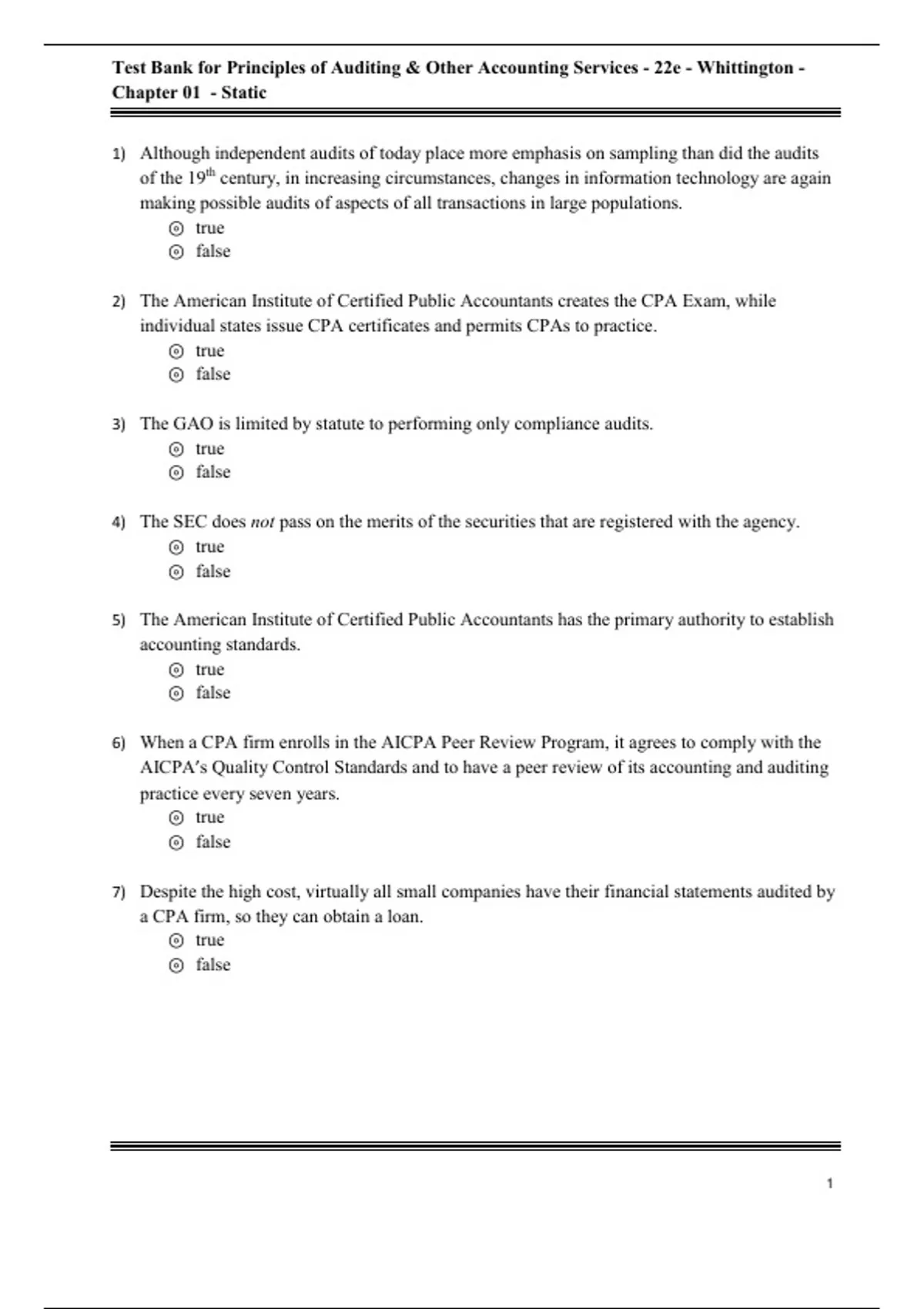 Test Bank for Principles of Auditing & Other Accounting Services - 22e - Whittington - Chapter 01 - Static 1) Although independent audits of today place more emphasis on sampling than did the audits of the 19th century, in increasing circumstances, changes in information technology are again making possible audits of aspects of all transactions in large populations. ⊚ true ⊚ false 2) The American Institute of Certified Public Accountants creates the CPA Exam, while individual states issue CPA certificates and permits CPAs to practice. ⊚ true ⊚ false 3) The GAO is limited by statute to performing only compliance audits. ⊚ true ⊚ false 4) The SEC does not pass on the merits of the securities that are registered with the agency. ⊚ true ⊚ false 5) The American Institute of Certified Public Accountants has the primary authority to establish accounting standards. ⊚ true ⊚ false 6) When a CPA firm enrolls in the AICPA Peer Review Program, it agrees to comply with the AICPA’s Quality Control Standards and to have a peer review of its accounting and auditing practice every seven years. ⊚ true ⊚ false 7) Despite the high cost, virtually all small companies have their financial statements audited by a CPA firm, so they can obtain a loan. ⊚ true ⊚ false 1 Test Bank for Principles of Auditing & Other Accounting Services - 22e - Whittington - Chapter 01 - Static 8) Senior auditors in CPA firms may be responsible for planning and coordinating audits on smaller engagements. ⊚ true ⊚ false 9) The Sarbanes-Oxley Act requires that auditors of certain publicly traded companies in the United States perform an integrated audit that inclu des providing assurance on both the financial statements and on compliance with laws and regulations. ⊚ true ⊚ false 10) Auditing is frequently only a small part of the practice of local CPA firms. ⊚ true ⊚ false 11) A summary of findings rather than assurance is most l ikely to be included in a(n): A) Agreed-upon procedures report. B) Compilation report. C) Audit report. D) Review report. 12) The Statements on Auditing Standards have been issued by the: A) Auditing Standards Board. B) Financial Accounting Standards Board. C) Securities and Exchange Commission. D) Federal Bureau of Investigation. 13) The risk that a company ’s financial statements will materially depart from generally accepted accounting principles is referred to as: A) Business Risk. B) Information Risk. C) Detection Risk. D) Document Risk. 2 Test Bank for Principles of Auditing & Other Accounting Services - 22e - Whittington - Chapter 01 - Static 14) Historically, which of the following has the AICPA been most concerned with providing? A) Auditing standards. B) Professional guidance for regulating financial markets. C) Internal auditing standards. D) Staff support to Congress. 15) The organization charged with protec ting investors and the public by requiring full disclosure of financial information by companies offering securities to the public is the: A) Auditing Standards Board. B) Financial Accounting Standards Board. C) Government Accounting Standards Boards. D) Securities and Exchange Commission. 16) An engagement in which a CPA firm arranges for a critical review of its practices by another CPA firm is referred to as a(n): A) Peer Review Engagement. B) Quality Control Engagement. C) Quality Assurance Engagement. D) Attestation Engagement. 17) The sequentially-numbered pronouncements issued by the Auditing Standards Board over a period of years are known as: A) Auditing Statements of Position (ASPs). B) Accounting Series Releases (ASRs). C) Statements on Auditing Standards (SASs). D) Statements on Auditing Principles (SAPs). 18) Government Accountability Office (GAO): A) is primarily concerned with rapid processing of all accounts payable incurred by the federal government. B) responsibilities include audits of government agencies. C) is an organization of professional accountants whose primary interest is in the effectiveness of presidential expenditures. D) is primarily concerned with budgets and forecasts approved by the PCAOB. 3 Test Bank for Principles of Auditing & Other Accounting Services - 22e - Whittington - Chapter 01 - Static 19) The risk associated with survivability and profitability is referred to as: A) Information risk. B) Inherent risk. C) Relative risk. D) Business risk. 20) The risk that a company will not be able to meet its obligations when they become due is an aspect of: A) Information risk. B) Inherent risk. C) Relative risk. D) Business risk. 21) Which of the following attributes is more essential for an auditor than of management? A) Integrity. B) Competence. C) Independence. D) Keeping informed on current professional developments. 22) The attest function: A) Is an essential part of every engagement by the CPA, whether performing auditing, tax work, or other services. B) Includes the preparation of a report of the CPA's findings. C) Requires a consideration of internal control. D) Requires a complete review of all transactions durin g the period under examination. 23) Attestation risk is limited to a low level in which of the following engagement(s)? A) Both examinations and reviews. B) Examinations, but not reviews. C) Reviews, but not examinations. D) Neither examinations nor reviews. 24) When compared to an audit performed prior to 1900, an audit today: A) Is more likely to use sampling in more areas. B) Is less likely to include consideration of the effectiveness of internal control. C) Has bank loan officers as the primary financial statement user group. D) Includes a more detailed examination of all individual transactions. 4