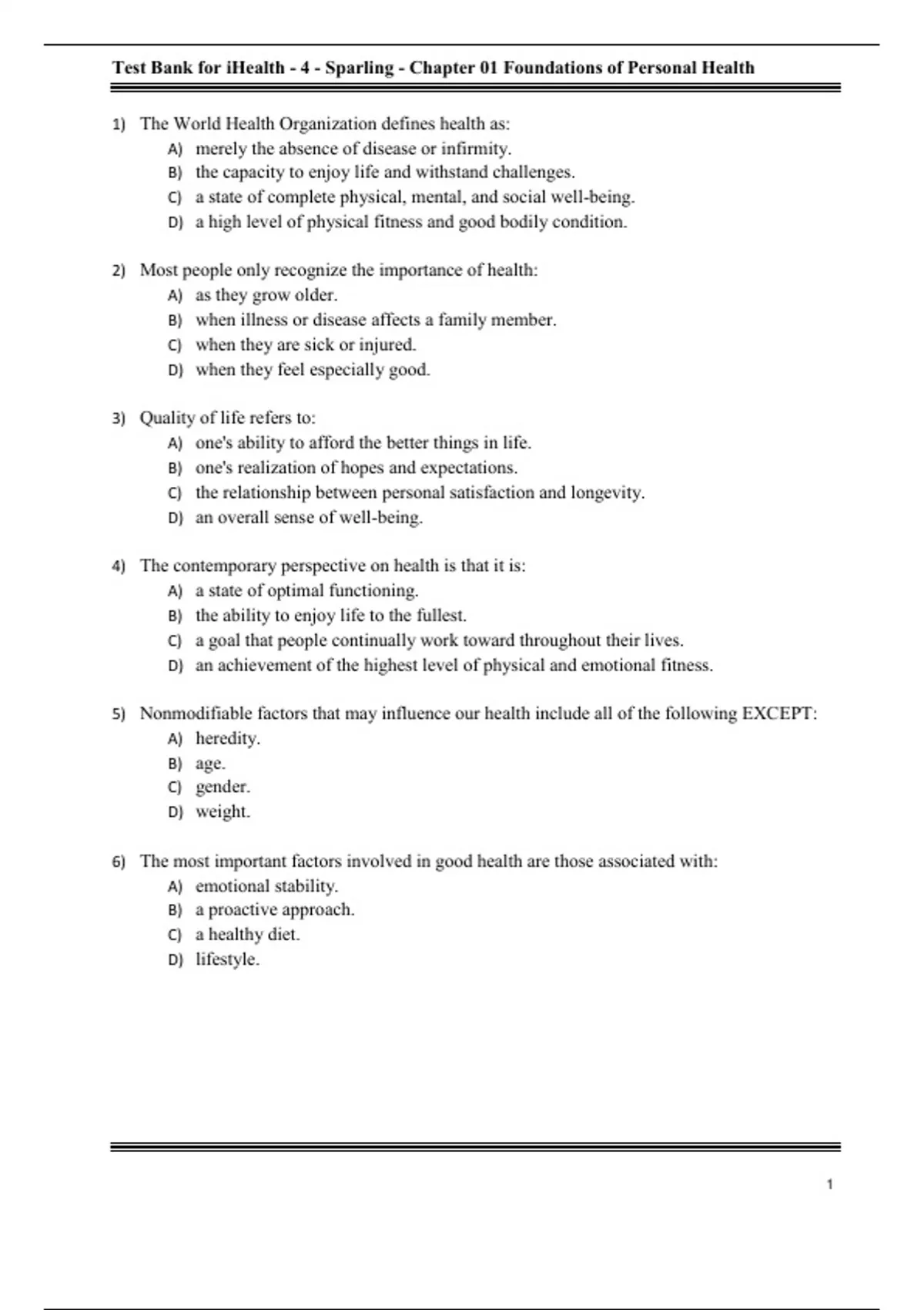 Test Bank For iHealth, 4th Edition All Chapters - 9781260241075