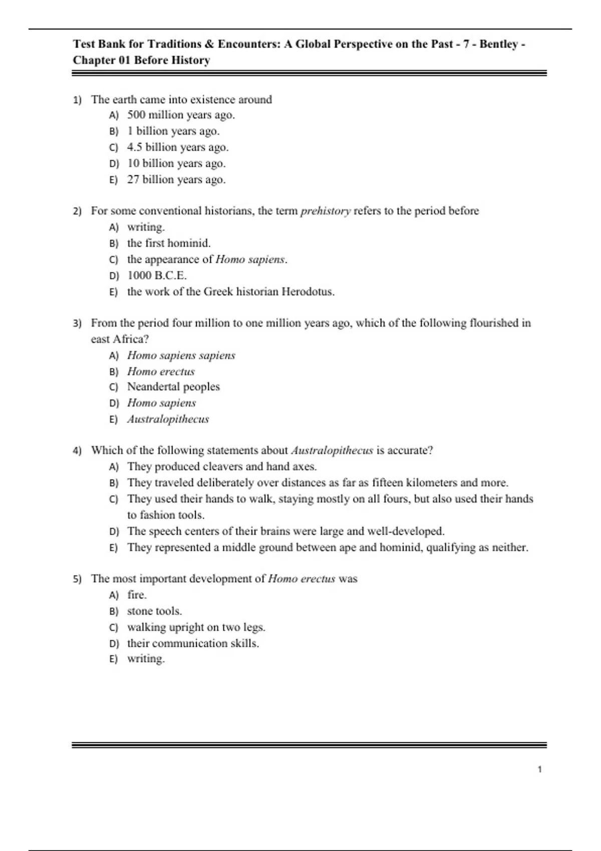 Test Bank for Traditions & Encounters: A Global Perspective on the Past - 7 - Bentley - Chapter 01 Before History 1) The earth came into existence around A) 500 million years ago. B) 1 billion years ago. C) 4.5 billion years ago. D) 10 billion years ago. E) 27 billion years ago. 2) For some conventional historians, the term prehistory refers to the period before A) writing. B) the first hominid. C) the appearance of Homo sapiens. D) 1000 B.C.E. E) the work of the Greek historian Herodotus. 3) From the period four million to one million years ago, which of the following flourished in east Africa? A) Homo sapiens sapiens B) Homo erectus C) Neandertal peoples D) Homo sapiens E) Australopithecus 4) Which of the following statements about Australopithecus is accurate? A) They produced cleavers and hand axes. B) They traveled deliberately over distances as far as fifteen kilometers and more. C) They used their hands to walk, stayin g mostly on all fours, but also used their hands to fashion tools. D) The speech centers of their brains were large and well -developed. E) They represented a middle ground between ape and hominid, qualifying as neither. 5) The most important development of Homo erectus was A) fire. B) stone tools. C) walking upright on two legs. D) their communication skills. E) writing. 1 Test Bank for Traditions & Encounters: A Global Perspective on the Past - 7 - Bentley - Chapter 01 Before History 6) Which of the following statements about Homo erectus is accurate? A) They could produce complex tools but had little to no control over their environment. B) They kept to smaller bands of two to three individuals and sought to avoid even temporary interaction as larger groups. C) They had brains roughly the same size as those of the australopithecines, but better developed. D) They produced cleavers and hand axes. E) They lacked the physical dexterity of Homo habilis. 7) Which of the following effects did Homo sapiens have on their environment during the paleolithic era? A) the rapid extinction of Neandertals B) the transformation of rivers through widespread irrigation systems C) widespread deforestation across several continents D) the extinction of horses in the Americas E) the extinction of several plant species in Africa and Europe due to over -cultivation 8) Which of the following key differences from other animal species and hominids helped Homo sapiens develop language? A) opposable thumbs and complex prehensile digits B) living in communal structures involving numerous individuals C) artistic and creative abilities D) vocal cords and a separate mouth cavity with a tongue E) the ability to create and use tools 9) Between sixty and fifteen thousand years ago, Homo sapiens used superior intelligence, sophisticated tools, and language to A) build cities. B) travel through and exploit the natural world more efficiently than any other species. C) establish complex social and political institutions. D) develop the first known tools and controlled use of fire. E) develop farming communities. 2 Test Bank for Traditions & Encounters: A Global Perspective on the Past - 7 - Bentley - Chapter 01 Before History 10) Which of the following statements is true of the inhabitants of the paleolithic age? A) They had mastered writing. B) They domesticated an imals. C) They were hunters and gatherers. D) They had discovered agriculture. E) They had mastered working with iron. 11) Why did paleolithic societies possess much more gender equality than neolithic ones? A) There was much greater gender interdependence in food produc tion. B) Women were valued and sometimes deified for their role in childbearing. C) Paleolithic social structures developed to be matrilineal in nature. D) Women proved move valuable in the maintenance of agricultural systems than men. E) Paleolithic communities were much smaller, making each individual more valuable for the survival of the whole. 12) The foraging lifestyle required A) male-dominated societies. B) life in small bands, of which modern examples have thirty to fifty members. C) near-total isolation of groups from each other. D) women to devote most of their time to child -rearing. E) total gender equality. 13) The Venus figurines A) were first found in the ruins of Çatal Hüyük. B) date back to the time of Australopithecus. C) were representative of the matriarchal societies of the ne olithic age. D) are representations of the goddess of love, found in Jericho. E) reflect early humans' deep interest in fertility. 14) With the development of languages, human beings were able to A) produce long cutting edges. B) accumulate knowledge and transmit it to new generations. C) begin to fashion sharp tools from animal bones. D) devise means for catching fish from deep waters. E) invent spear throwers. 3 Test Bank for Traditions & Encounters: A Global Perspective on the Past - 7 - Bentley - Chapter 01 Before History 15) One of the interpretations of the early human cave paintings is that they represent A) positive proof of the limited inte llectual world of the early human. B) early worship of the forces of evil. C) a variety of sympathetic magic. D) the first conscious development of art for its own sake. E) a complicated, and so far indecipherable, written language. 16) What do archaeologists now believe is the most fundamental difference between the neolithic and paleolithic eras? A) artistry B) use of tools C) use of fire D) reliance on foraging for subsistence E) reliance on cultivation for subsistence 17) Which of the following effects did slash-and-burn cultivation have on the communities that used it? A) It prevented the communities that used it from experimenting with new crops. B) It allowed larger communities to develop than other forms of agriculture and cultivation. C) It encouraged migra tion through a need to move to new forested regions. D) It spurred a need for domesticated animals and carts, which led to the development of the wheel. E) It encourage
