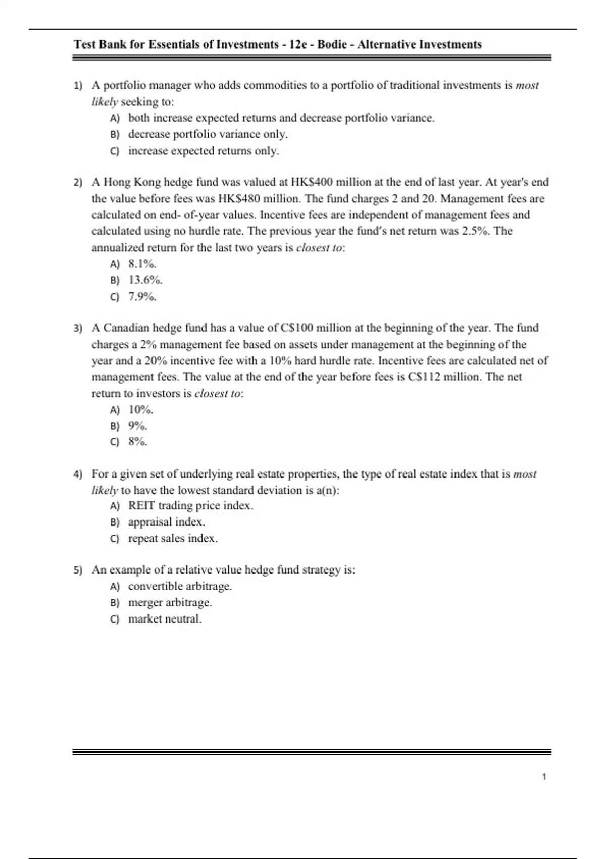Test Bank For Essentials of Investments, 12th Edition All Chapters - 9781260772166