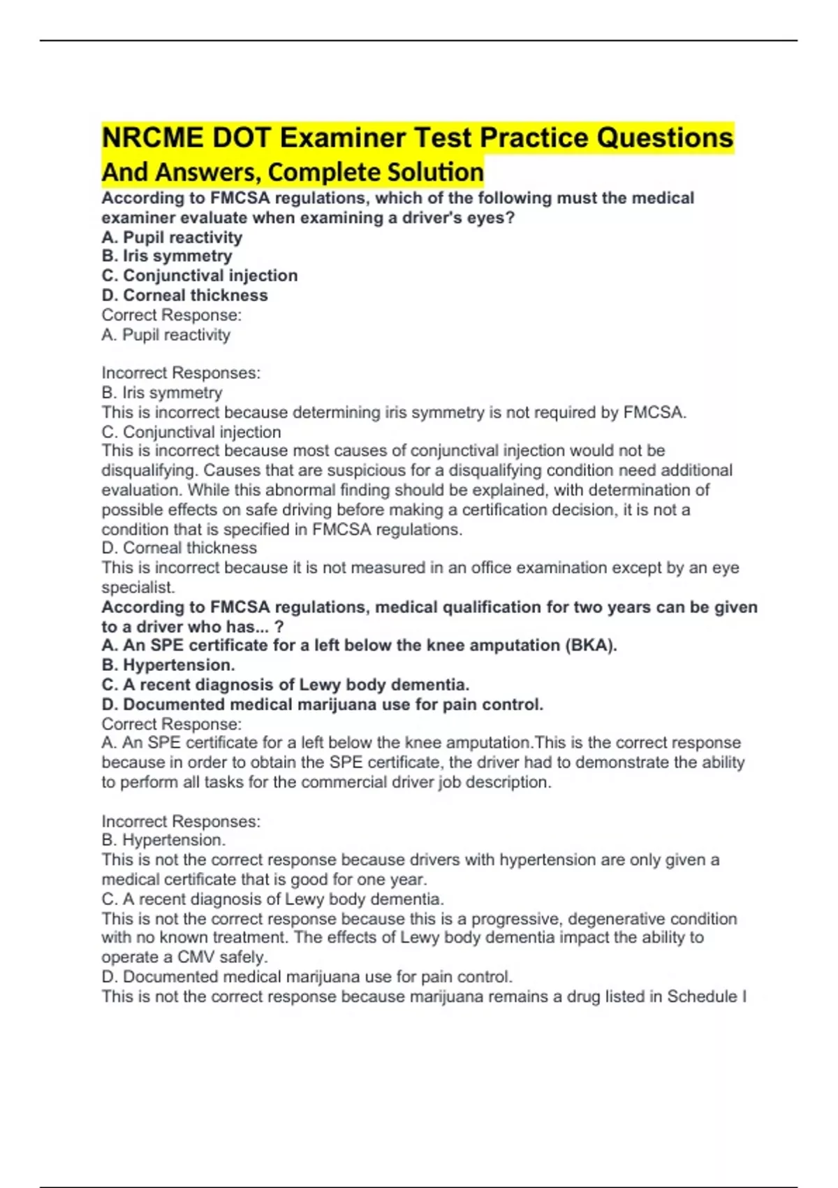 NRCME DOT Examiner Test Practice Questions And Answers, Complete Solution According to FMCSA regulations, which of the following must the medical examiner evaluate when examining a driver's eyes? A. Pupil reactivity B. Iris symmetry C. Conjunctival injection D. Corneal thickness Correct Response: A. Pupil reactivity Incorrect Responses: B. Iris symmetry This is incorrect because determining iris symmetry is not required by FMCSA. C. Conjunctival injection This is incorrect because most causes of conjunctival injection would not be disqualifying. Causes that are suspicious for a disqualifying condition need additional evaluation. While this abnormal finding should be explained, with determination of possible effects on safe driving before making a certification decision, it is not a condition that is specified in FMCSA regulations. D. Corneal thickness This is incorrect because it is not measured in an office examination except by an eye specialist. According to FMCSA regulations, medical qualification for two years can be given to a driver who has... ? A. An SPE certificate for a left below the knee amputation (BKA). B. Hypertension. C. A recent diagnosis of Lewy body dementia. D. Documented medical marijuana use for pain control. Correct Response: A. An SPE certificate for a left below the knee amputation.This is the correct response because in order to obtain the SPE certificate, the driver had to demonstrate the ability to perform all tasks for the commercial driver job description. Incorrect Responses: B. Hypertension. This is not the correct response because drivers with hypertension are only given a medical certificate that is good for one year. C. A recent diagnosis of Lewy body dementia. This is not the correct response because this is a progressive, degenerative condition with no known treatment. The effects of Lewy body dementia impact the ability to operate a CMV safely. D. Documented medical marijuana use for pain control. This is not the correct respo