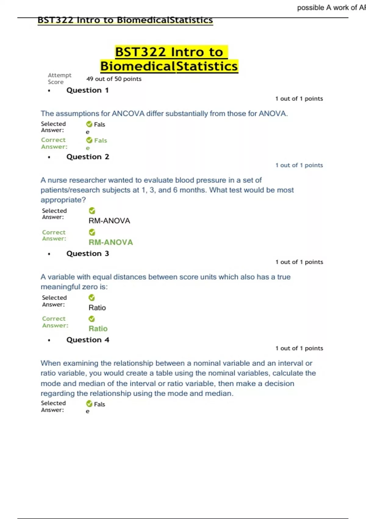 • Question 1 1 out of 1 points The assumptions for ANCOVA differ substantially from those for ANOVA. Selected Answer: Correct Answer: Fals e Fals e • Question 2 A nurse researcher wanted to evaluate blood pressure in a set of 1 out of 1 points patients/research subjects at 1, 3, and 6 months. What test would be most appropriate? Selected Answer: RM-ANOVA Correct Answer: RM-ANOVA • Question 3 1 out of 1 points A variable with equal distances between score units which also has a true meaningful zero is: Selected Answer: Ratio Correct Answer: Ratio • Question 4 1 out of 1 points When examining the relationship between a nominal variable and an interval or ratio variable, you would create a table using the nominal variables, calculate the mode and median of the interval or ratio variable, then make a decision regarding the relationship using the mode and median. Selected Answer: Fals e Correct Answer: Fals e • Question 5 1 out of 1 points Data which uses numbers to provide categories or labels as well as the ordering of the categories are: Selected Answer: Ordinal Correct Answer: Ordinal • Question 6 Parametric tests can be used with any type of data. 1 out of 1 points Selected Answer: Correct Answer: Fals e Fals e • Question 7 1 out of 1 points Not all variables retained in a regression model are required to be significant. Selected Answer: Correct Answer: True Tru e • Question 8 1 out of 1 points To determine the proportion of variability in one variable that can be accounted for or explained by the variability of a second variable, you would calculate a correlation coefficient, then square it. Selected Answer: Correct Answer: True Tru e • Question 9 1 out of 1 points This is used to compare means while controlling for the effect of a covariate. Selected Answer: ANCOVA Correct Answer: ANCOVA • Question 10 The distribution of chi-square values is NOT normally distributed. 1 out of 1 points Selected Answer: Correct Answer: True Tru e