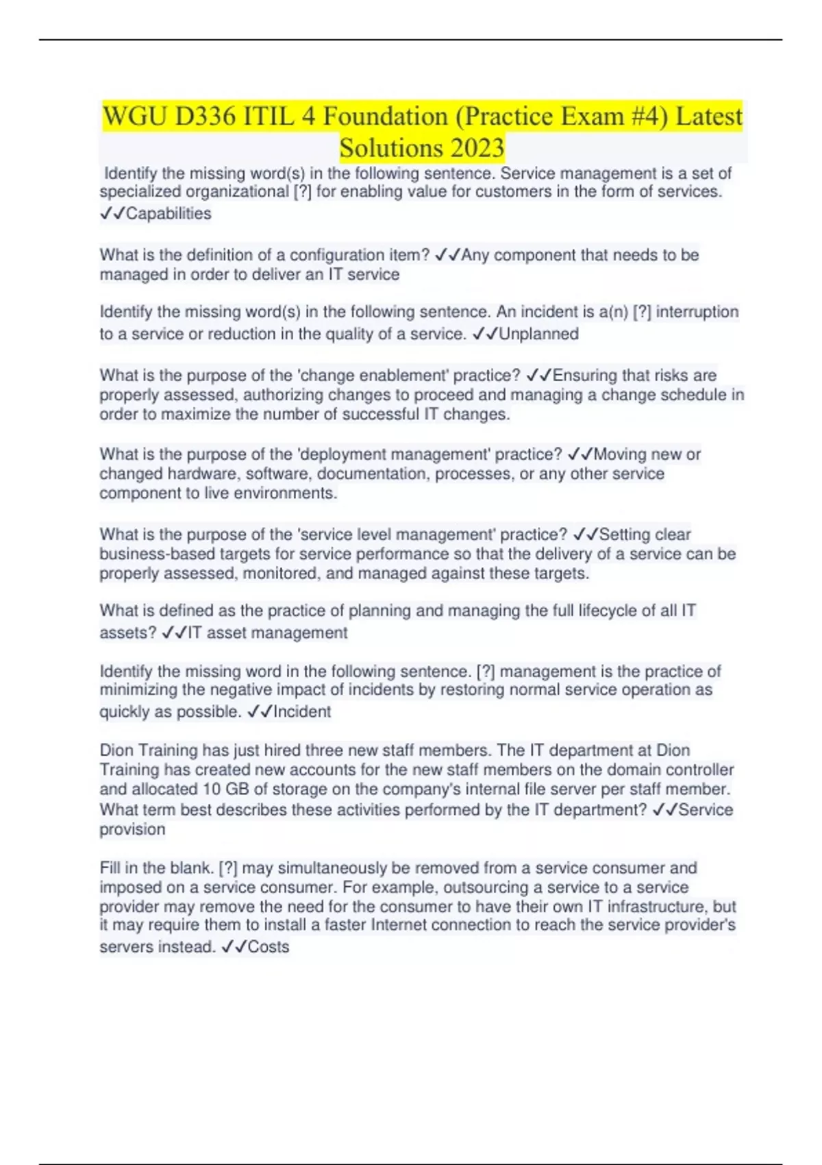 WGU D336 ITIL 4 Foundation (Practice Exam #4) Latest Solutions 2023 WGU D336 ITIL 4 Foundation (Practice Exam #4) Latest Solutions 2023 WGU D336 ITIL 4 Foundation (Practice Exam #4) Latest Solutions 2023