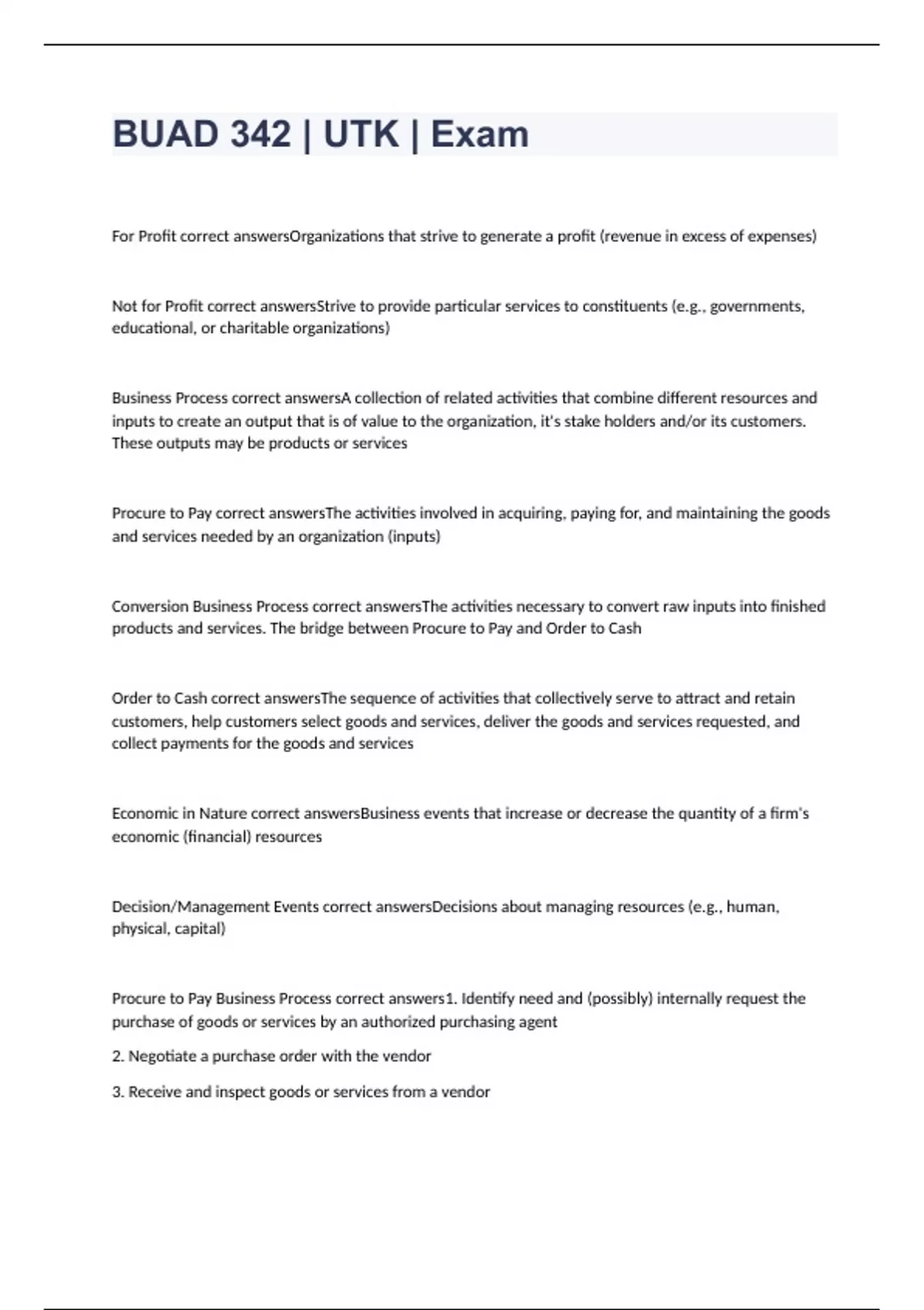 For Profit correct answersOrganizations that strive to generate a profit (revenue in excess of expenses) Not for Profit correct answersStrive to provide particular services to constituents (e.g., governments, educational, or charitable organizations) Business Process correct answersA collection of related activities that combine different resources and inputs to create an output that is of value to the organization, it's stake holders and/or its customers. These outputs may be products or services Procure to Pay correct answersThe activities involved in acquiring, paying for, and maintaining the goods and services needed by an organization (inputs) Conversion Business Process correct answersThe activities necessary to convert raw inputs into finished products and services. The bridge between Procure to Pay and Order to Cash Order to Cash correct answersThe sequence of activities that collectively serve to attract and retain customers, help customers select goods and services, deliver the goods and services requested, and collect payments for the goods and services
