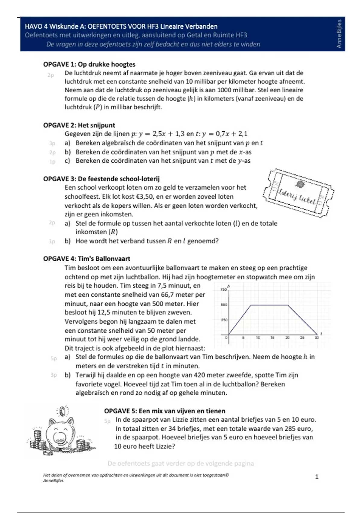 HAVO Wiskunde A: HF 3 Lineaire Verbanden Oefentoets met antwoorden en uitleg