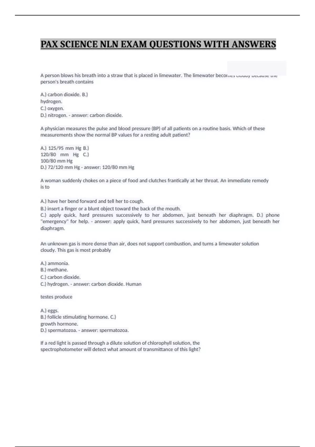 PAX SCIENCE NLN EXAM QUESTIONS WITH ANSWERS