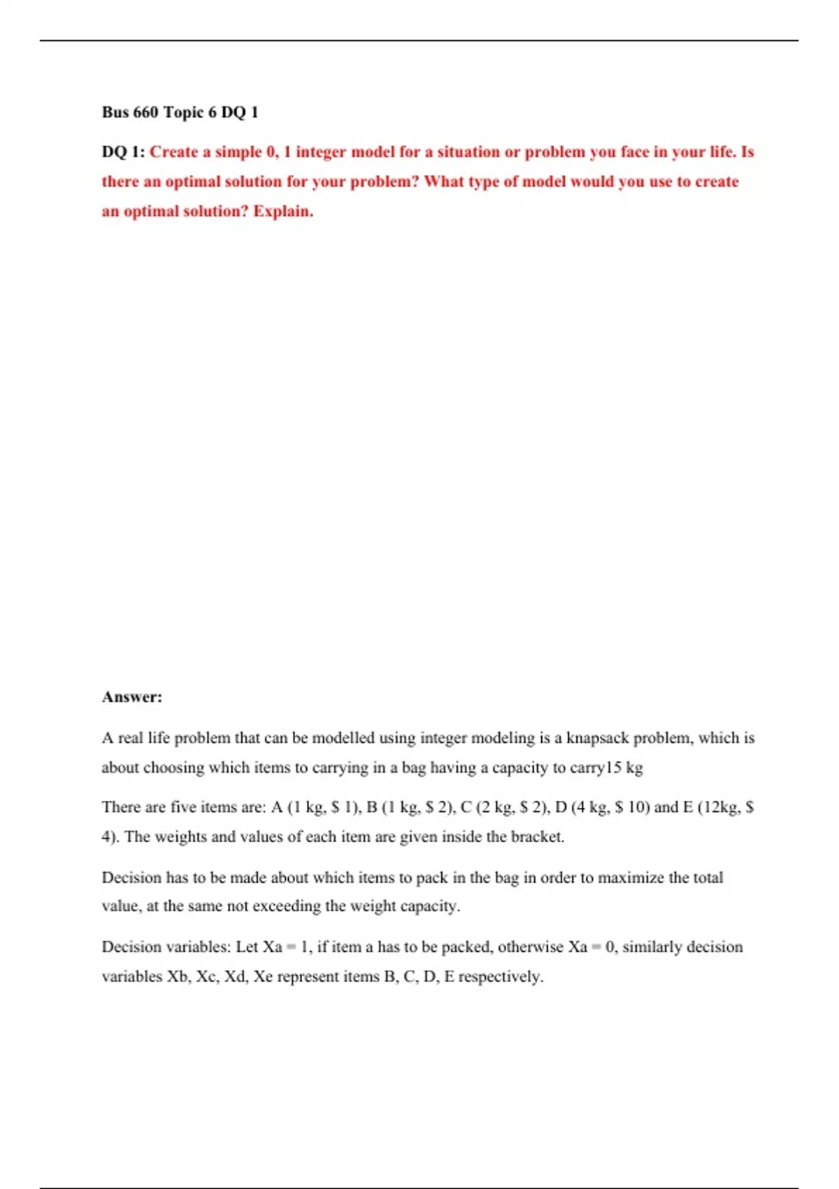 Bus 660 Topic 6 DQ 1 DQ 1: Create a simple 0, 1 integer model for a situation or problem you face in your life. Is there an optimal solution for your problem? What type of model would you use to create an optimal solution? Explain.