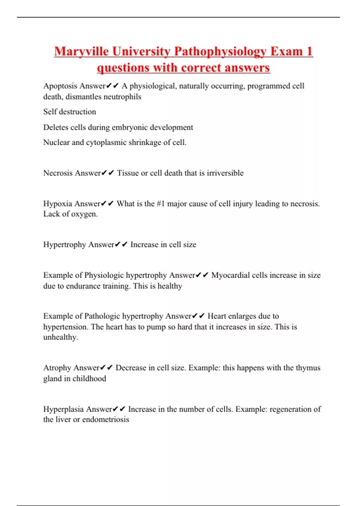 Apoptosis Answer A physiological, naturally occurring, programmed cell death, dismantles neutrophils Self destruction Deletes cells during embryonic development Nuclear and cytoplasmic shrinkage of cell. Necrosis Answer Tissue or cell death that is irriversible Hypoxia Answer What is the #1 major cause of cell injury leading to necrosis. Lack of oxygen. Hypertrophy Answer Increase in cell size Example of Physiologic hypertrophy Answer Myocardial cells increase in size due to endurance training. This is healthy Example of Pathologic hypertrophy Answer Heart enlarges due to hypertension. The heart has to pump so hard that it increases in size. This is unhealthy. Atrophy Answer Decrease in cell size. Example: this happens with the thymus gland in childhood