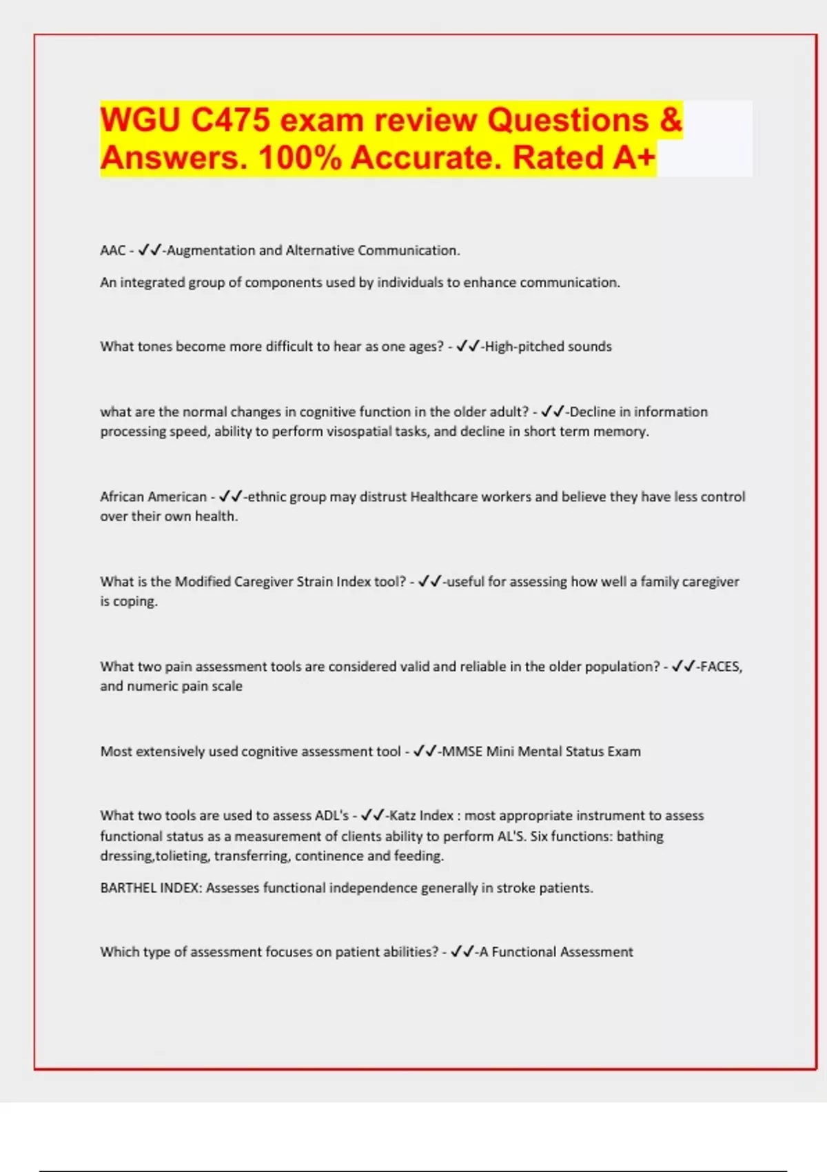 WGU C475 exam review Questions & Answers. 100% Accurate. Rated A+ AAC - -Augmentation and Alternative Communication. An integrated group of components used by individuals to enhance communication. What tones become more difficult to hear as one ages? - -High-pitched sounds what are the normal changes in cognitive function in the older adult? - -Decline in information processing speed, ability to perform visospatial tasks, and decline in short term memory. African American - -ethnic group may distrust Healthcare workers and believe they have less control over their own health. What is the Modified Caregiver Strain Index tool? - -useful for assessing how well a family caregiver is coping. What two pain assessment tools are considered valid and reliable in the older population? - -FACES, and numeric pain scale Most extensively used cognitive assessment tool - -MMSE Mini Mental Status Exam What two tools are used to assess ADL's - -Katz Index : most appropriate instrument to assess functional status as a measurement of clients ability to perform AL'S. Six functions: bathing dressing,tolieting, transferring, continence and feeding. BARTHEL INDEX: Assesses functional independence generally in stroke patients. Which type of assessment focuses on patient abilities? - -A Functional Assessment