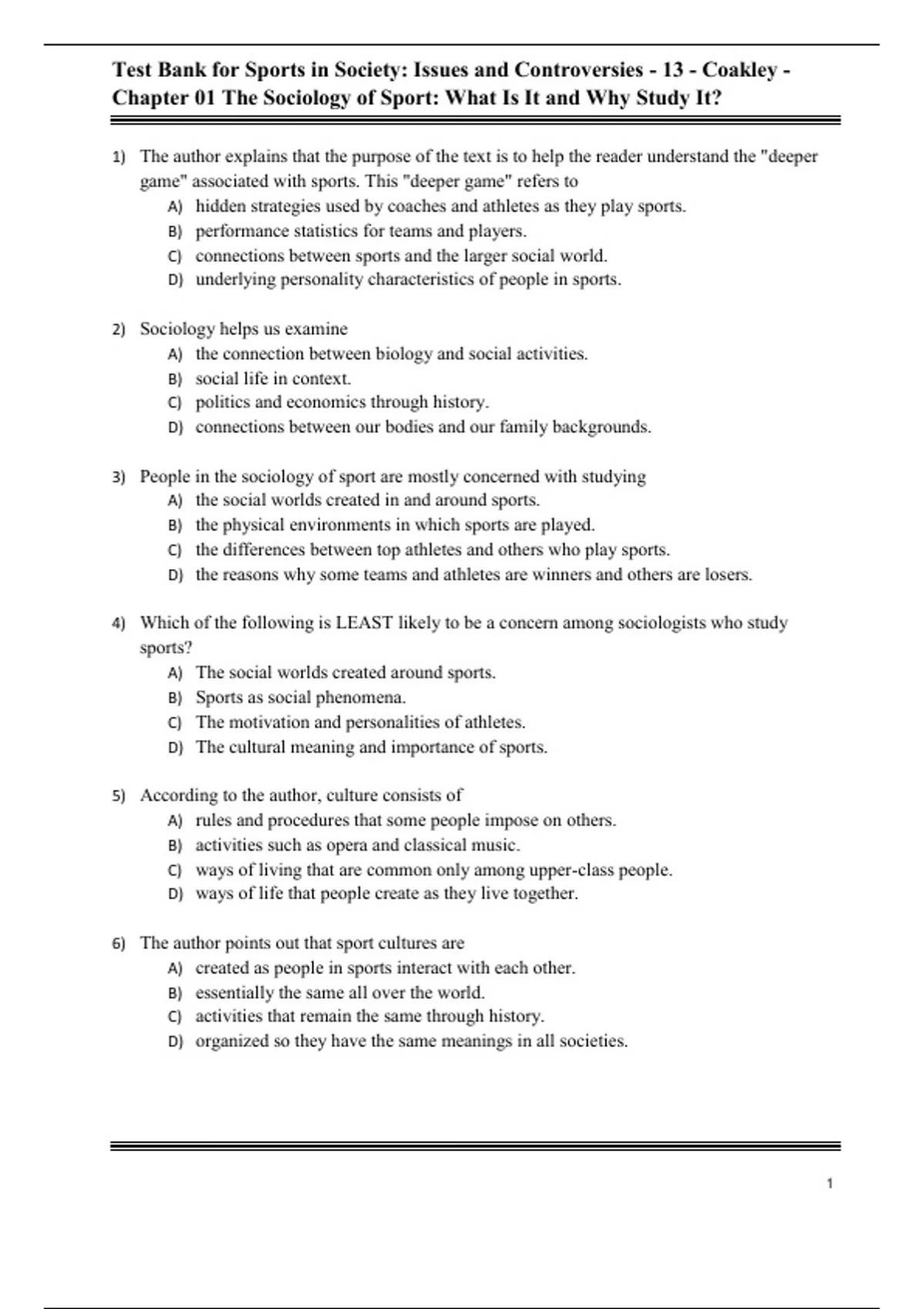 Test Bank For Sports in Society: Issues and Controversies, 13th Edition All Chapters - 9781260240665