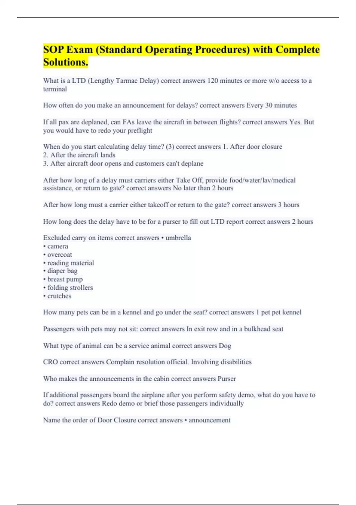 What is a LTD (Lengthy Tarmac Delay) correct answers 120 minutes or more w/o access to a terminal How often do you make an announcement for delays? correct answers Every 30 minutes If all pax are deplaned, can FAs leave the aircraft in between flights? correct answers Yes. But you would have to redo your preflight When do you start calculating delay time? (3) correct answers 1. After door closure 2. After the aircraft lands 3. After aircraft door opens and customers can't deplane After how long of a delay must carriers either Take Off, provide food/water/lav/medical assistance, or return to gate? correct answers No later than 2 hours After how long must a carrier either takeoff or return to the gate? correct answers 3 hours How long does the delay have to be for a purser to fill out LTD report correct answers 2 hours Excluded carry on items correct answers • umbrella • camera • overcoat • reading material • diaper bag • breast pump • folding strollers • crutches How many pets can be in a kennel and go under the seat? correct answers 1 pet pet kennel Passengers with pets may not sit: correct answers In exit row and in a bulkhead seat What type of animal can be a service animal correct answers Dog CRO correct answers Complain resolution official. Involving disabilities Who makes the announcements in the cabin correct answers Purser If additional passengers board the airplane after you perform safety demo, what do you have to do? correct answers Redo demo or brief those passengers individually Name the order of Door Closure correct answers • announcement