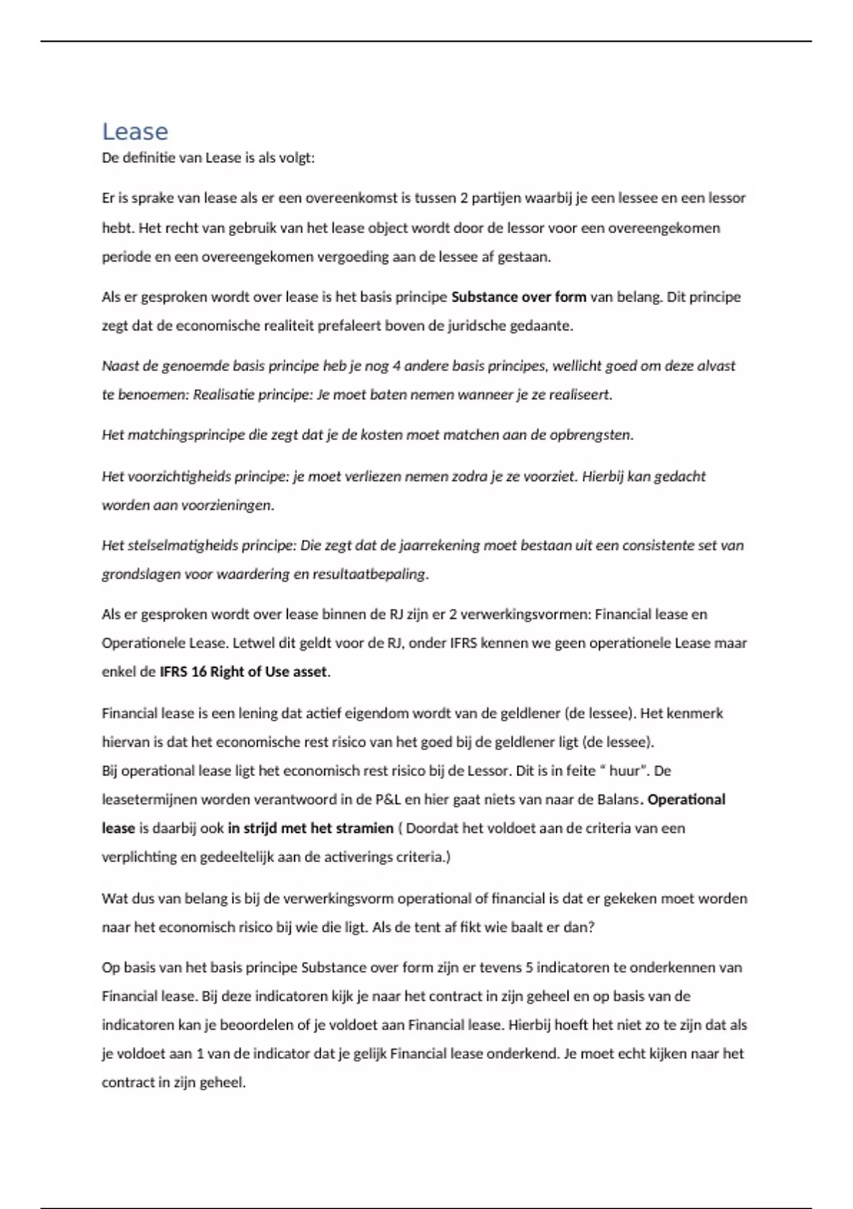 Als er gesproken wordt over lease is het basis principe Substance over form van belang. Dit principe
