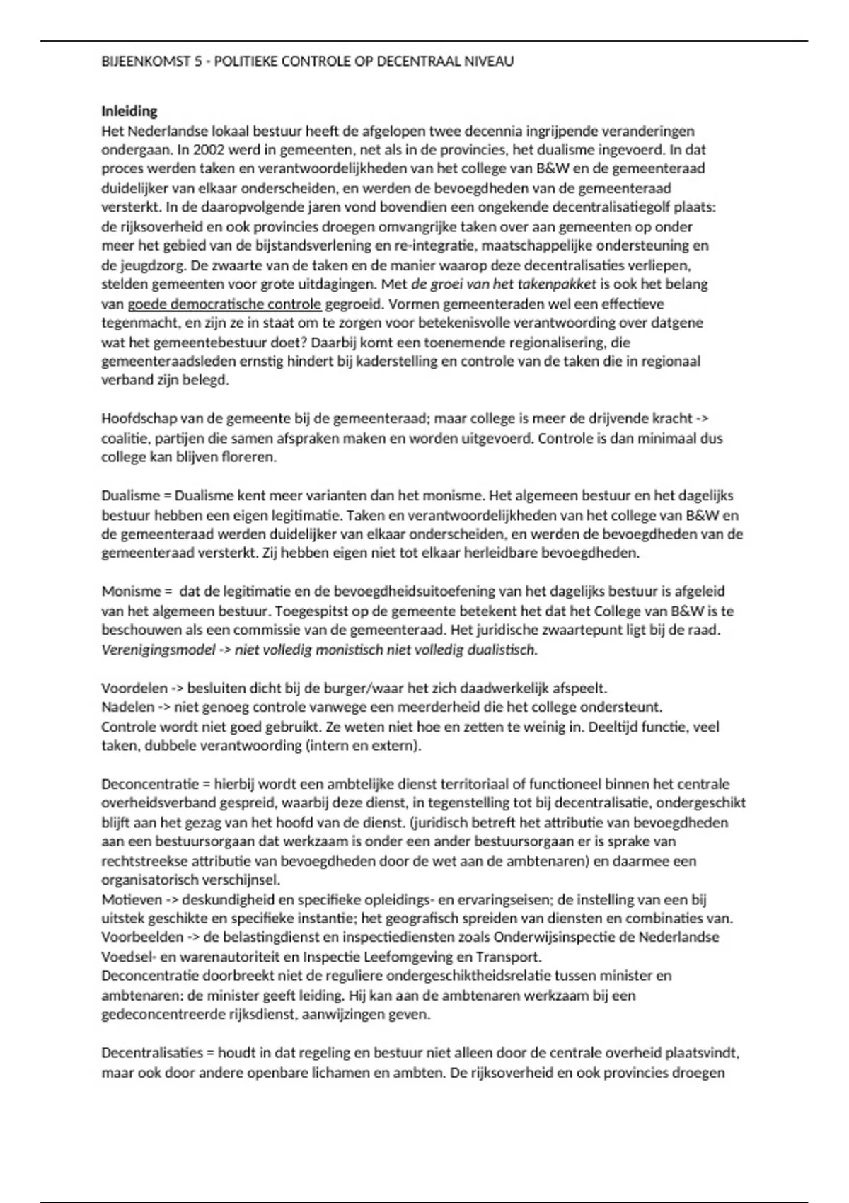 BIJEENKOMST 5 - POLITIEKE CONTROLE OP DECENTRAAL NIVEAU