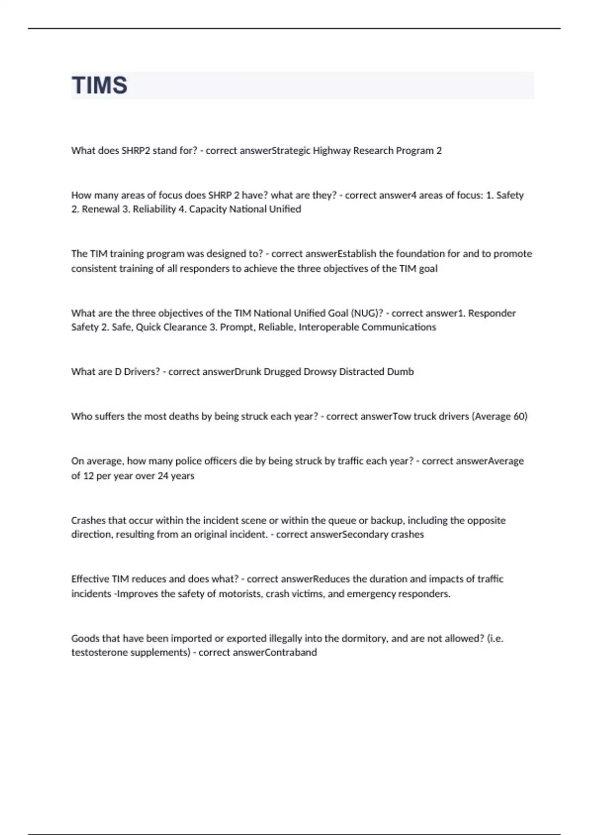 What does SHRP2 stand for? - correct answerStrategic Highway Research Program 2 How many areas of focus does SHRP 2 have? what are they? - correct answer4 areas of focus: 1. Safety 2. Renewal 3. Reliability 4. Capacity National Unified The TIM training program was designed to? - correct answerEstablish the foundation for and to promote consistent training of all responders to achieve the three objectives of the TIM goal What are the three objectives of the TIM National Unified Goal (NUG)? - correct answer1. Responder Safety 2. Safe, Quick Clearance 3. Prompt, Reliable, Interoperable Communications What are D Drivers? - correct answerDrunk Drugged Drowsy Distracted Dumb Who suffers the most deaths by being struck each year? - correct answerTow truck drivers (Average 60) On average, how many police officers die by being struck by traffic each year? - correct answerAverage of 12 per year over 24 years Crashes that occur within the incident scene or within the queue or backup, including the opposite direction, resulting from an original incident. - correct answerSecondary crashes Effective TIM reduces and does what? - correct answerReduces the duration and impacts of traffic incidents -Improves the safety of motorists, crash victims, and emergency responders. Goods that have been imported or exported illegally into the dormitory, and are not allowed? (i.e. testosterone supplements) - correct answerContraband