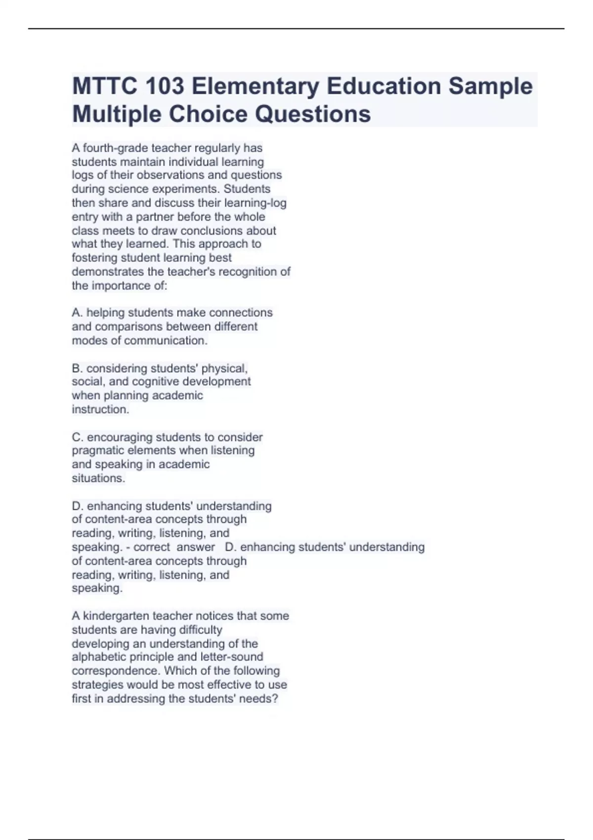 mttc 103 elementary education sample multiple choi