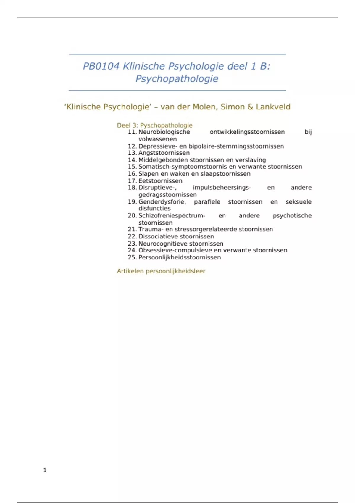 Uitgebreide samenvatting klinische psychologie 1, deel 2: psychopathologie + beknopte samenvatting artikelen persoonlijkheidsleer (uitgewerkt in het Nederlands) Open Universiteit: PB0104 Hoofdstuk 11 t/m 25 van het boek 'Klinische Psychologie' van Molen, Simon en Lankveld