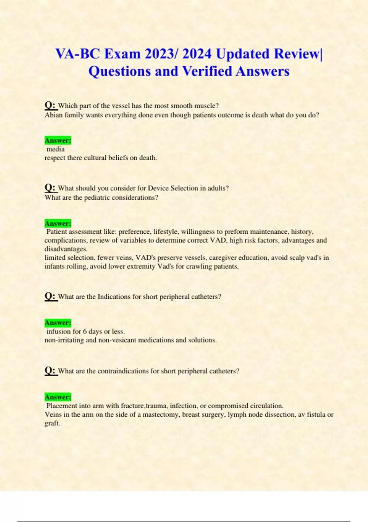 VA-BC Exam 2023/ 2024 Updated Review| Questions and Verified Answers Q: Which part of the vessel has the most smooth muscle? Abian family wants everything done even though patients outcome is death what do you do? Answer: media respect there cultural beliefs on death. Q: What should you consider for Device Selection in adults? What are the pediatric considerations? Answer: Patient assessment like: preference, lifestyle, willingness to preform maintenance, history, complications, review of variables to determine correct VAD, high risk factors, advantages and disadvantages. limited selection, fewer veins, VAD's preserve vessels, caregiver education, avoid scalp vad's in infants rolling, avoid lower extremity Vad's for crawling patients. Q: What are the Indications for short peripheral catheters? Answer: infusion for 6 days or less. non-irritating and non-vesicant medications and solutions. Q: What are the contraindications for short peripheral catheters? Answer: Placement into arm with fracture,trauma, infection, or compromised circulation. Veins in the arm on the side of a mastectomy, breast surgery, lymph node dissection, av fistula or graft. Q: What are the preferred vessels for Short peripheral catheters? Answer: metacarpal, cephalic, basilic, accessory veins in arm. Q: What are the insertion procedures for short peripheral catheters? Answer: follow guidelines, aseptic technique, 2 attempts per provider, limit of 2 providers, smallest gauge possible to deliver therapy. Q: What are pediatric considerations for short peripheral catheters? Answer: Metacarpal, cephalic, basic, scalp and saphenous veins may be used. Use imaging devices to minimize iv attempts and secure with approved devices. Q: What are the indications for MIDLINE catheters? Answer: infusion for 6 days to 4 weeks. Non-irritating and Non-vesicant medications or solutions. Q: What are the contraindications for a MIDLINE? Answer: Placement in arm with fracture, trauma, infection, AV fistula, or compromised circulation. Chronic kidney disease patients. Q: What is the vessel selection for Midline?