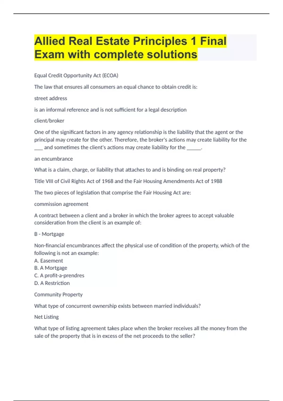 Allied Real Estate Principles 1 Final Exam with complete solutions
