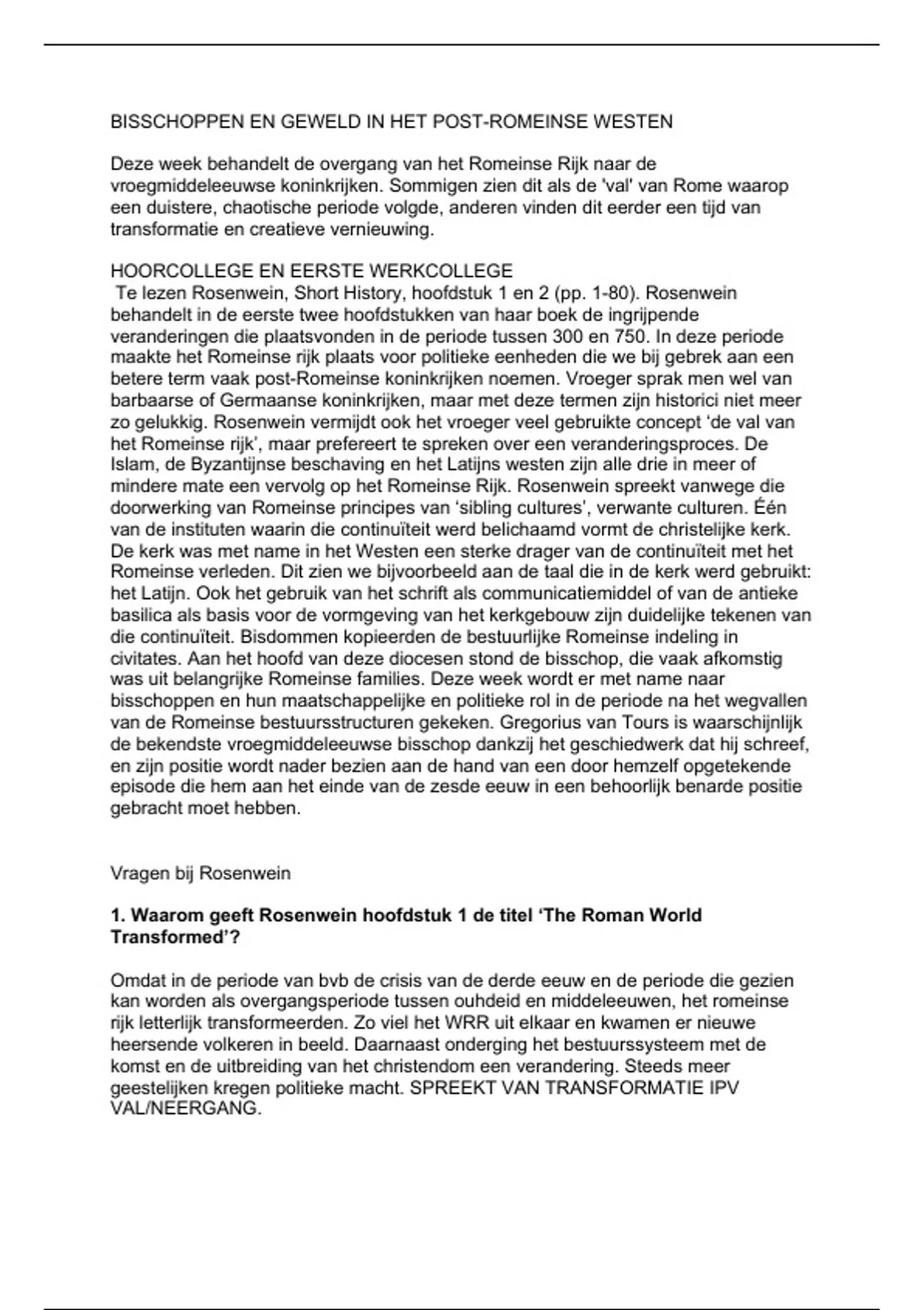 Te lezen Rosenwein, Short History, hoofdstuk 1 en 2 (pp. 1-80). Rosenwein