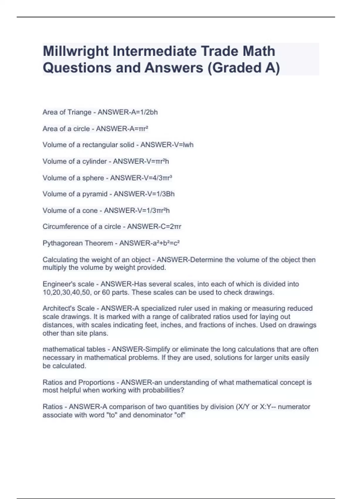 Millwright Intermediate Trade Math Questions and Answers (Graded A)Millwright Intermediate Trade Math Questions and Answers (Graded A)Millwright Intermediate Trade Math Questions and Answers (Graded A)Millwright Intermediate Trade Math Questions and Answers (Graded A) Area of Triange - ANSWER-A=1/2bh Area of a circle - ANSWER-A=πr² Volume of a rectangular solid - ANSWER-V=lwh Volume of a cylinder - ANSWER-V=πr²h