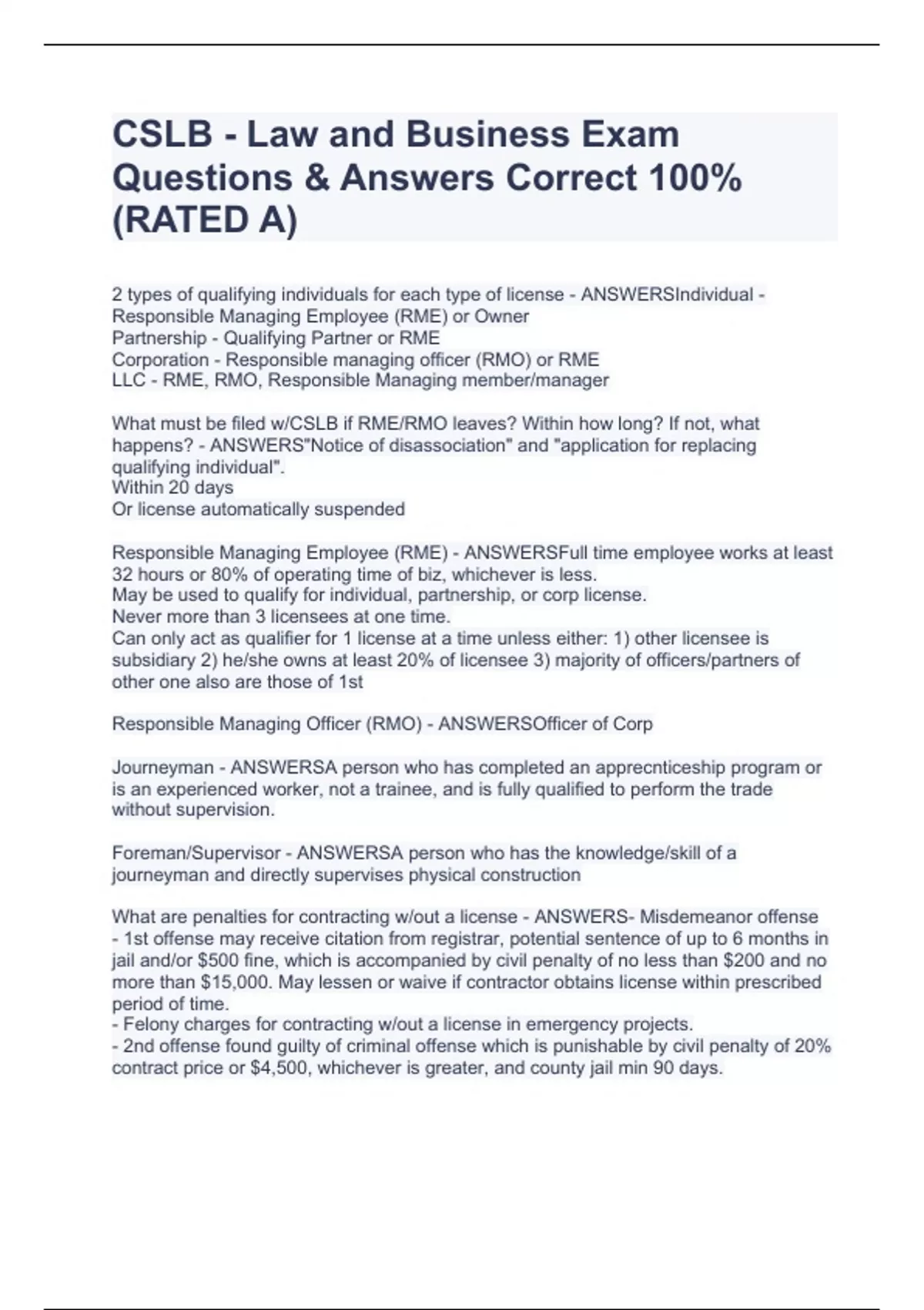2 types of qualifying individuals for each type of license - ANSWERSIndividual - Responsible Managing Employee (RME) or Owner Partnership - Qualifying Partner or RME Corporation - Responsible managing officer (RMO) or RME LLC - RME, RMO, Responsible Managing member/manager What must be filed w/CSLB if RME/RMO leaves? Within how long? If not, what happens? - ANSWERS"Notice of disassociation" and "application for replacing qualifying individual". Within 20 days Or license automatically suspended Responsible Managing Employee (RME) - ANSWERSFull time employee works at least 32 hours or 80% of operating time of biz, whichever is less. May be used to qualify for individual, partnership, or corp license. Never more than 3 licensees at one time. Can only act as qualifier for 1 license at a time unless either: 1) other licensee is subsidiary 2) he/she owns at least 20% of licensee 3) majority of officers/partners of other one also are those of 1st Responsible Managing Officer (RMO) - ANSWERSOfficer of Corp Journeyman - ANSWERSA person who has completed an apprecnticeship program or is an experienced worker, not a trainee, and is fully qualified to perform the trade without supervision. Foreman/Supervisor - ANSWERSA person who has the knowledge/skill of a journeyman and directly supervises physical construction What are penalties for contracting w/out a license - ANSWERS- Misdemeanor offense - 1st offense may receive citation from registrar, potential sentence of up to 6 months in jail and/or $500 fine, which is accompanied by civil penalty of no less than $200 and no more than $15,000. May lessen or waive if contractor obtains license within prescribed period of time. - Felony charges for contracting w/out a license in emergency projects. - 2nd offense found guilty of criminal offense which is punishable by civil penalty of 20% contract price or $4,500, whichever is greater, and county jail min 90 days. Penalty for advertising for work CSLB - Law and Business Exam Questions & Answers Correct 100%(RATED A)
