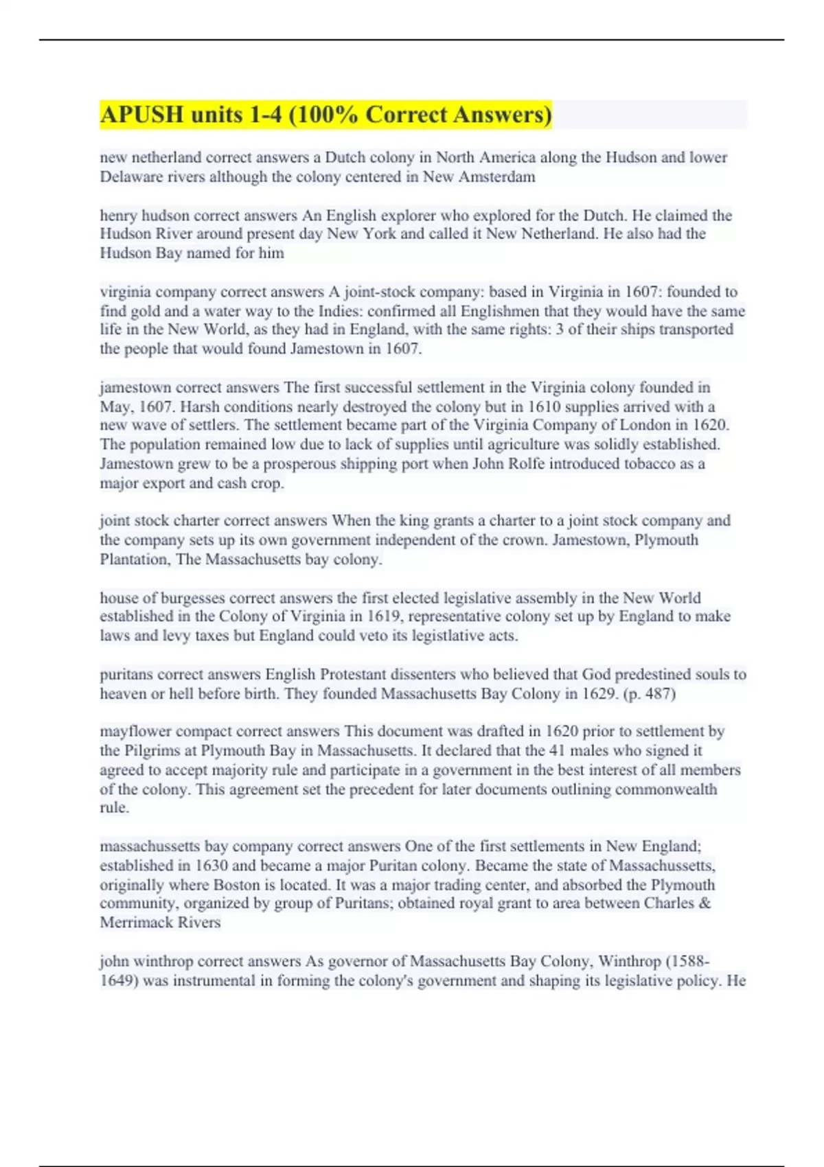 new netherland correct answers a Dutch colony in North America along the Hudson and lower Delaware rivers although the colony centered in New Amsterdam henry hudson correct answers An English explorer who explored for the Dutch. He claimed the Hudson River around present day New York and called it New Netherland. He also had the Hudson Bay named for him virginia company correct answers A joint-stock company: based in Virginia in 1607: founded to find gold and a water way to the Indies: confirmed all Englishmen that they would have the same life in the New World, as they had in England, with the same rights: 3 of their ships transported the people that would found Jamestown in 1607. jamestown correct answers The first successful settlement in the Virginia colony founded in May, 1607. Harsh conditions nearly destroyed the colony but in 1610 supplies arrived with a new wave of settlers. The settlement became part of the Virginia Company of London in 1620. The population remained low due to lack of supplies until agriculture was solidly established. Jamestown grew to be a prosperous shipping port when John Rolfe introduced tobacco as a major export and cash crop. joint stock charter correct answers When the king grants a charter to a joint stock company and the company sets up its own government independent of the crown. Jamestown, Plymouth Plantation, The Massachusetts bay colony. house of burgesses correct answers the first elected legislative assembly in the New World established in the Colony of Virginia in 1619, representative colony set up by England to make laws and levy taxes but England could veto its legistlative acts. puritans correct answers English Protestant dissenters who believed that God predestined souls to heaven or hell before birth. They founded Massachusetts Bay Colony in 1629. (p. 487) mayflower compact correct answers This document was drafted in 1620 prior to settlement by the Pilgrims at Plymouth Bay in Massachusetts. It declared that the 41 males who signed it agreed to accept majority rule and participate in a government in the best interest of all members of the colony. This agreement set the precedent for later documents outlining commonwealth rule. massachussetts bay company correct answers One of the first settlements in New England; established in 1630 and became a major Puritan colony. Became the state of Massachussetts, originally where Boston is located. It was a major trading center, and absorbed the Plymouth community, organized by group of Puritans; obtained royal grant to area between Charles & Merrimack Rivers john winthrop correct answers As governor of Massachusetts Bay Colony, Winthrop () was instrumental in forming the colony's government and shaping its legislative policy. He