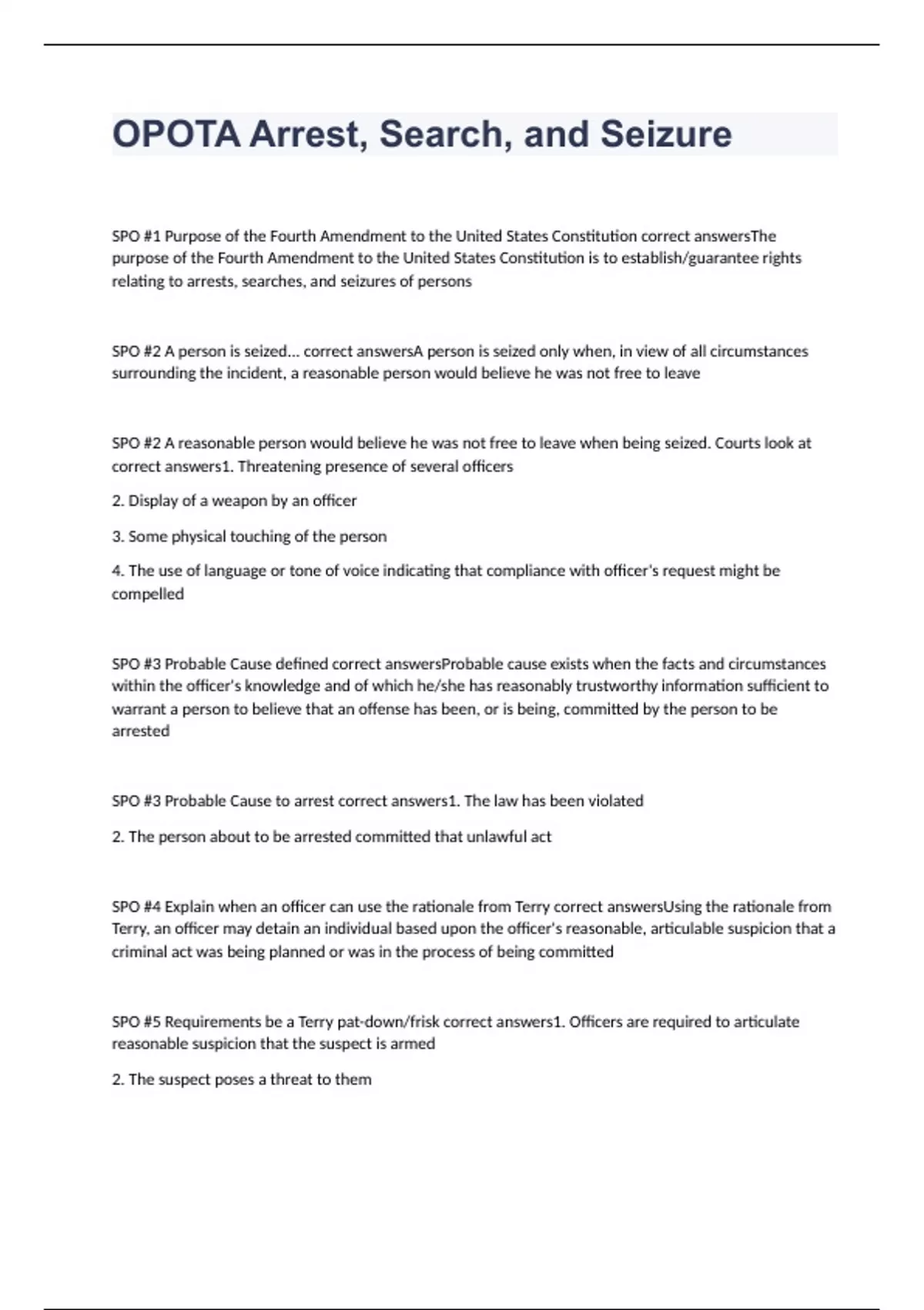 SPO #1 Purpose of the Fourth Amendment to the United States Constitution correct answersThe purpose of the Fourth Amendment to the United States Constitution is to establish/guarantee rights relating to arrests, searches, and seizures of persons SPO #2 A person is seized... correct answersA person is seized only when, in view of all circumstances surrounding the incident, a reasonable person would believe he was not free to leave SPO #2 A reasonable person would believe he was not free to leave when being seized. Courts look at correct answers1. Threatening presence of several officers 2. Display of a weapon by an officer 3. Some physical touching of the person 4. The use of language or tone of voice indicating that compliance with officer's request might be compelled SPO #3 Probable Cause defined correct answersProbable cause exists when the facts and circumstances within the officer's knowledge and of which he/she has reasonably trustworthy information sufficient to warrant a person to believe that an offense has been, or is being, committed by the person to be arrested SPO #3 Probable Cause to arrest correct answers1. The law has been violated 2. The person about to be arrested committed that unlawful act SPO #4 Explain when an officer can use the rationale from Terry correct answersUsing the rationale from Terry, an officer may detain an individual based upon the officer's reasonable, articulable suspicion that a criminal act was being planned or was in the process of being committed SPO #5 Requirements be a Terry pat-down/frisk correct answers1. Officers are required to articulate reasonable suspicion that the suspect is armed 2. The suspect poses a threat to them