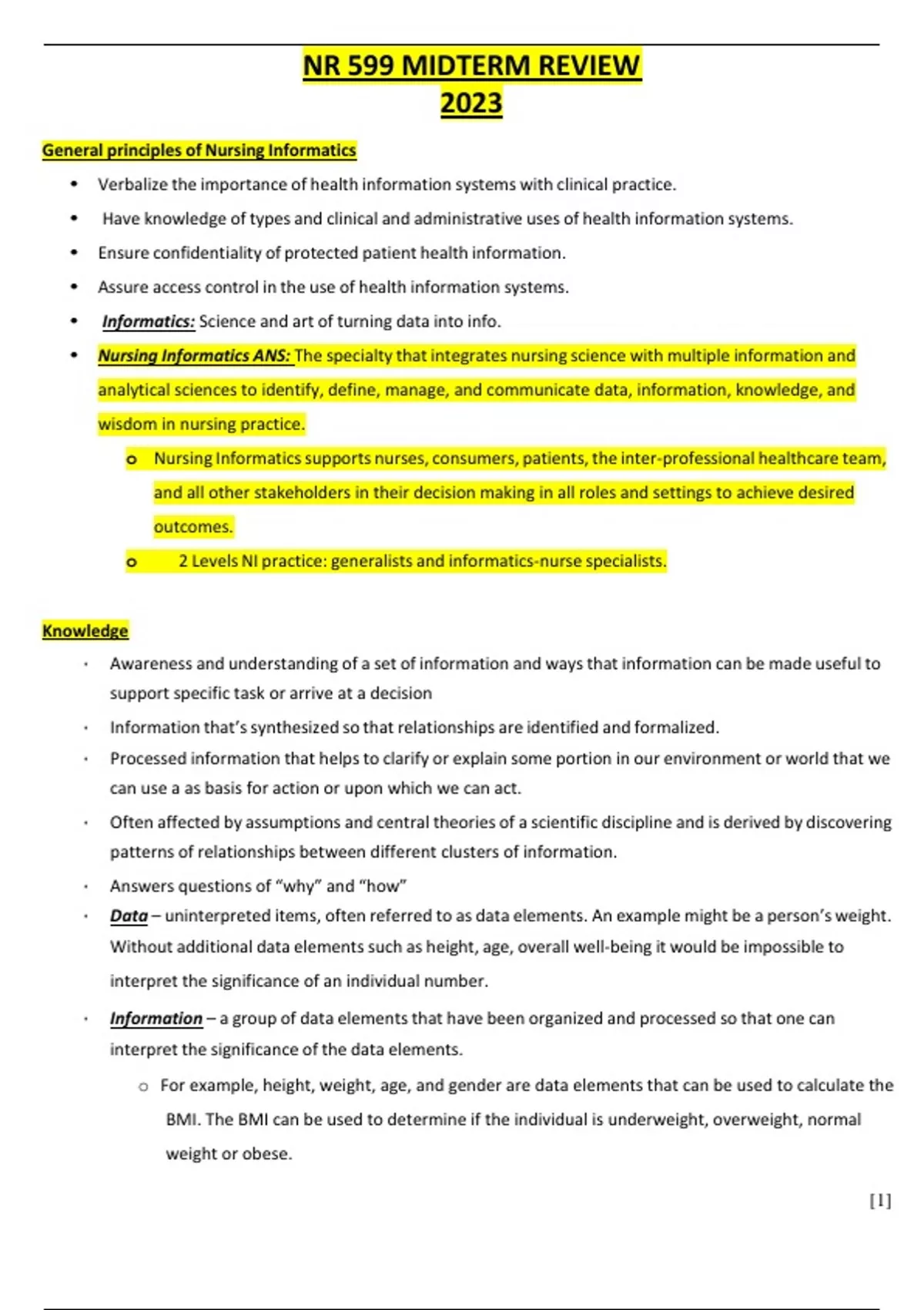 NR 599 MIDTERM REVIEW 2023 General principles of Nursing Informatics • Verbalize the importance of health information systems with clinical practice. • Have knowledge of types and clinical and administrative uses of health information systems. • Ensure confidentiality of protected patient health information. • Assure access control in the use of health information systems. • Informatics: Science and art of turning data into info. • Nursing Informatics ANS: The specialty that integrates nursing science with multiple information and analytical sciences to identify, define, manage, and communicate data, information, knowledge, and wisdom in nursing practice. o Nursing Informaticssupports nurses, consumers, patients,the inter-professional healthcare team, and all other stakeholders in their decision making in all roles and settings to achieve desired outcomes. o 2 Levels NI practice: generalists and informatics-nurse specialists. Knowledge • Awareness and understanding of a set of information and ways that information can be made useful to support specific task or arrive at a decision • Information that’ssynthesized so that relationships are identified and formalized. • Processed information that helps to clarify or explain some portion in our environment or world that we can use a as basis for action or upon which we can act. • Often affected by assumptions and central theories of a scientific discipline and is derived by discovering patterns of relationships between different clusters of information. • Answers questions of “why” and “how” • Data – uninterpreted items, often referred to as data elements. An example might be a person’s weight. Without additional data elements such as height, age, overall well-being it would be impossible to interpret the significance of an individual number. • Information – a group of data elementsthat have been organized and processed so that one can interpret the significance of the data elements. o For example, height, weight, age, and gender are data elements that can be used to calculate the BMI. The BMI can be used to determine if the individual is underweight, overweight, normal weight or obese. [2] • Knowledge - is built on a formalization of the relationships and interrelationships between data and information. A knowledge base makes it possible to understand that an individual may have a calculated BMI that is over 30 and not be obese. • At this time, several automated decision support systems included a knowledge base and a set of rules for applying the knowledge base in a specific situation. o For example, the knowledge base may include the following information. A fever or elevated temperature often begins with a chill. At the beginning of the chill the patient’s temperature may be normal or even sub-normal but in 30 minutes it is likely the patient will have spiked a temp. A rule might read: if a patient complains of chills, then take the patient’stemperature and repeat in 30 minutes. Wisdom • Appropriate use of data, information, and knowledge in making decisions and implementing nursing actions. • Guidesthe nurse in recognizing the situation at hand based on patients’ values, nurse’s experience, and healthcare knowledge. • Implies a form of ethics, or knowing why certain things or procedures should or should not be implemented in healthcare practice. • Includesthe ability to integrate data, information, and knowledge with professional values when managing specific human problems. • The use of knowledge and experience to heighten common sense and insight so as to exercise sound judgment in practical matters. • Thought to be the highest form of common sense, resulting from accumulated knowledge. • Ability to apply viable and valuable knowledge, experience, understanding, and insight while being prudent and sensible. • Appropriate use of knowledge to solve human problems. Scientific Underpinning • The scientific underpinnings of practice provide the basis of knowledge for advanced nursing practice. • These scientific underpinnings include sciencessuch as biology, physiology, psychology, ethics, and nursing. • The sciences underpinning nursing informatics: Nursing science, information science, and computer science [3] • The advent of nursing science, specifically middle-range nursing theories, expanded the discipline of nursing. Thorough understanding of nursing theory provides a solid foundation for advanced nursing practice. • The importance of using science-based conceptsto evaluate and enhance health care delivery and improve patient outcomes. The Foundation of Knowledge Model • Model that proposesthat humans are organic information systems constantly acquiring, processing, and generating information or knowledge in both their professional and personal lives. • Involvesintegrating four main kinds of knowledge, which are: knowledge acquisition, knowledge dissemination, knowledge generation and knowledge processing. o Knowledge worker: working with info. And generating info and knowledge as a product. o Knowledge acquirer: Providing convenient and efficient means of capturing and storing knowledge. o Knowledge engineers: Designing developing, implementing, and maintaining knowledge. o Knowledge managers: Capturing and processing collective expertise and distributing it. o Knowledge developers and generators: Changing and evolving knowledge based on the tasks at hand and the information available. • With time, we begin to transform our experiences and applied knowledge into it highest form known as...wisdom. • Knowledge is a powerful tool and that nurses focus on information as a key building block of knowledge. Computer science • Studiesthe theory underpinning information and computation and their implementation in computer systems. • Looks at how the human mind works from an information processing perspective. • Studiesthe theoretical foundations of i