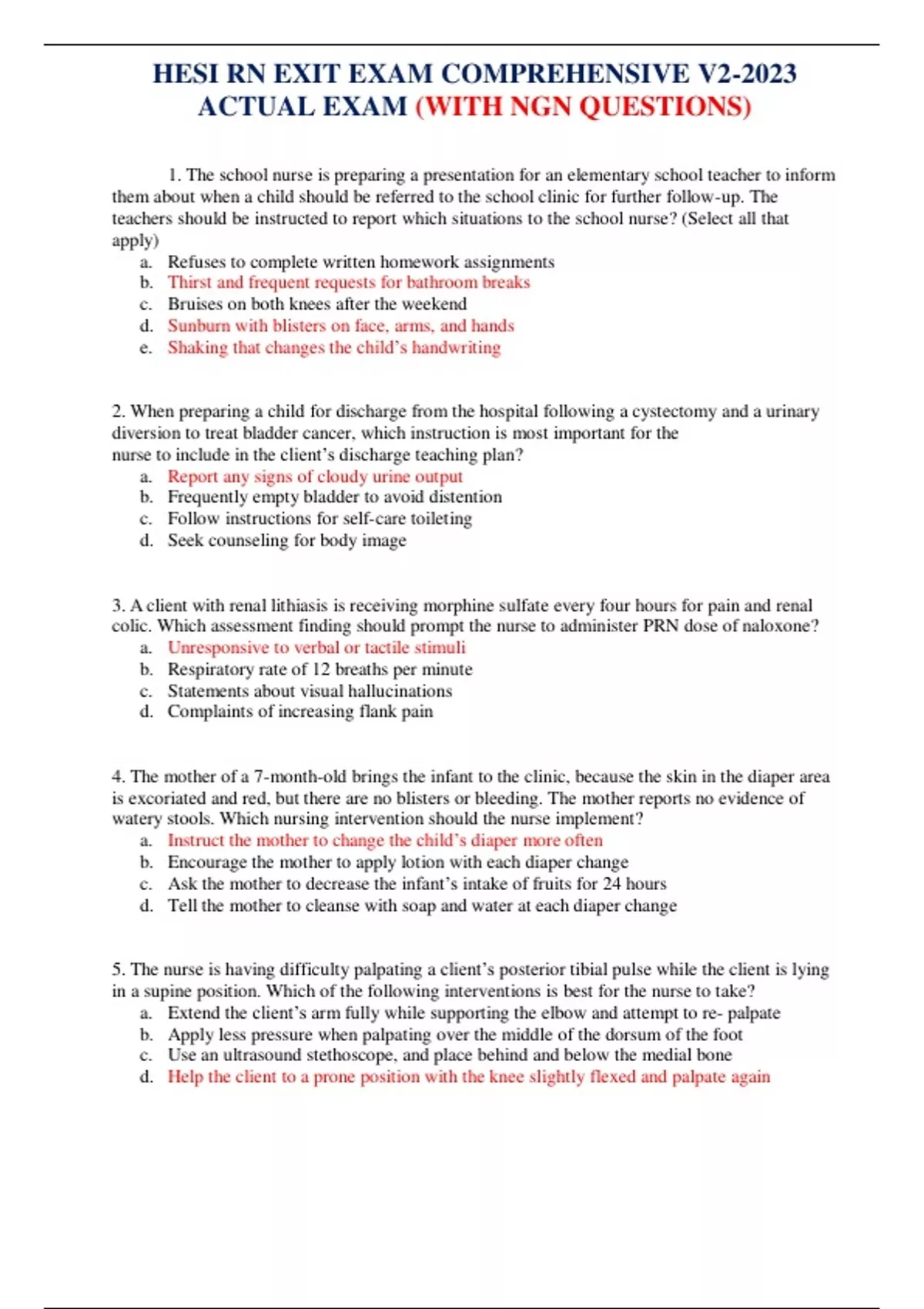 HESI RN EXIT EXAM COMPREHENSIVE V2-2023 ACTUAL EXAM (WITH NGN QUESTIONS) 1. The school nurse is preparing a presentation for an elementary school teacher to inform them about when a child should be referred to the school clinic for further follow-up. The teachers should be instructed to report which situations to the school nurse? (Select all that apply) a. Refuses to complete written homework assignments b. Thirst and frequent requests for bathroom breaks c. Bruises on both knees after the weekend d. Sunburn with blisters on face, arms, and hands e. Shaking that changes the child’s handwriting 2. When preparing a child for discharge from the hospital following a cystectomy and a urinary diversion to treat bladder cancer, which instruction is most important for the nurse to include in the client’s discharge teaching plan? a. Report any signs of cloudy urine output b. Frequently empty bladder to avoid distention c. Follow instructions for self-care toileting d. Seek counseling for body image 3. A client with renal lithiasis is receiving morphine sulfate every four hours for pain and renal colic. Which assessment finding should prompt the nurse to administer PRN dose of naloxone? a. Unresponsive to verbal or tactile stimuli b. Respiratory rate of 12 breaths per minute c. Statements about visual hallucinations d. Complaints of increasing flank pain 4. The mother of a 7-month-old brings the infant to the clinic, because the skin in the diaper area is excoriated and red, but there are no blisters or bleeding. The mother reports no evidence of watery stools. Which nursing intervention should the nurse implement? a. Instruct the mother to change the child’s diaper more often b. Encourage the mother to apply lotion with each diaper change c. Ask the mother to decrease the infant’s intake of fruits for 24 hours d. Tell the mother to cleanse with soap and water at each diaper change 5. The nurse is having difficulty palpating a client’s posterior tibial pulse while the client is lying in a supine position. Which of the following interventions is best for the nurse to take? a. Extend the client’s arm fully while supporting the elbow and attempt to re- palpate b. Apply less pressure when palpating over the middle of the dorsum of the foot c. Use an ultrasound stethoscope, and place behind and below the medial bone d. Help the client to a prone position with the knee slightly flexed and palpate again