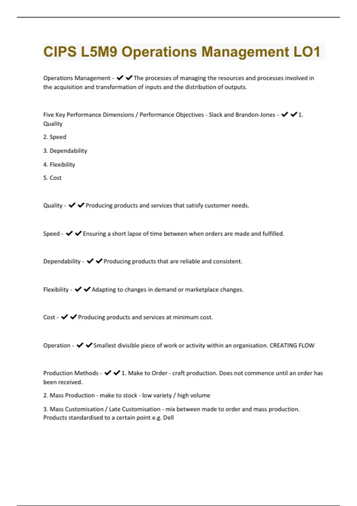 Operations Management - The processes of managing the resources and processes involved in the acquisition and transformation of inputs and the distribution of outputs. Five Key Performance Dimensions / Performance Objectives - Slack and Brandon-Jones - 1. Quality 2. Speed 3. Dependability 4. Flexibility 5. Cost Quality - Producing products and services that satisfy customer needs. Speed - Ensuring a short lapse of time between when orders are made and fulfilled. Dependability - Producing products that are reliable and consistent. Flexibility - Adapting to changes in demand or marketplace changes. Cost - Producing products and services at minimum cost. Operation - Smallest divisible piece of work or activity within an organisation. CREATING FLOW Production Methods - 1. Make to Order - craft production. Does not commence until an order has been received. 2. Mass Production - make to stock - low variety / high volume 3. Mass Customisation / Late Customisation - mix between made to order and mass production. Products standardised to a certain point e.g. DellI T O - Input - Transformation - Output The market is the point in which an output transforms into an input Input - * Materials * Information * Customers Transformation - * Facilities * Staff * Infrastructure e.g. road, rail, air * IT * Marketing Four V's - 1. Volume - quantity of products / services produced 2. Variety - of products / services produced 3. Visibility - of the process to customers 4. Variation - changes in demand for products / services Order Qualification - Competitive standards that make an organisations products viewed as fit for purpose by customers Order Winning - Standards that separate the products from on organisation to another