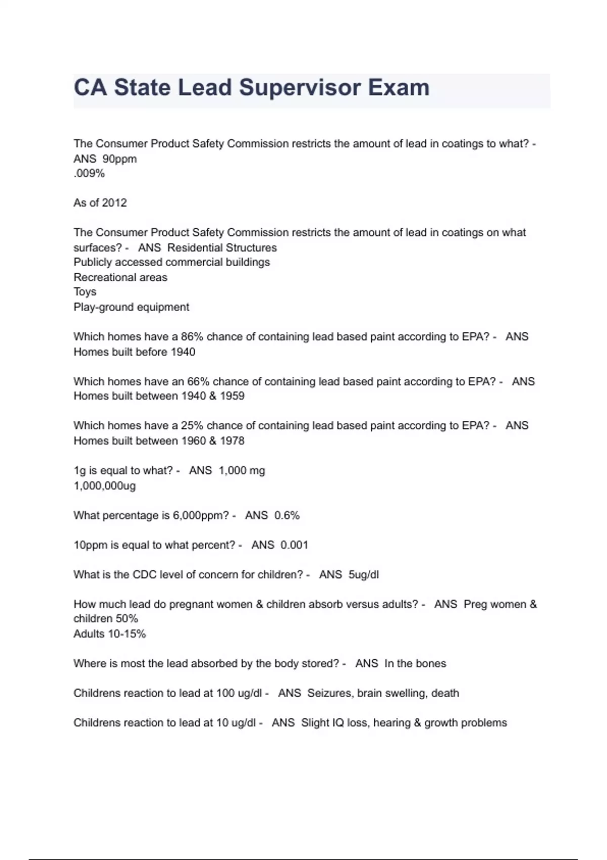 CA State Lead Supervisor Exam Questions With Complete Solutions he Consumer Product Safety Commission restricts the amount of lead in coatings to what? - ANS 90ppm .009% As of 2012 The Consumer Product Safety Commission restricts the amount of lead in coatings on what surfaces? - ANS Residential Structures Publicly accessed commercial buildings Recreational areas Toys Play-ground equipment Which homes have a 86% chance of containing lead based paint according to EPA? - ANS Homes built before 1940 Which homes have an 66% chance of containing lead based paint according to EPA? - ANS Homes built between 1940 & 1959 Which homes have a 25% chance of containing lead based paint according to EPA? - ANS Homes built between 1960 & 1978 1g is equal to what? - ANS 1,000 mg 1,000,000ug What percentage is 6,000ppm? - ANS 0.6% 10ppm is equal to what percent? - ANS 0.001 What is the CDC level of concern for children? - ANS 5ug/dl How much lead do pregnant women & children absorb versus adults? - ANS Preg women & children 50% Adults 10-15% Where is most the lead absorbed by the body stored? - ANS In the bones Childrens reaction to lead at 100 ug/dl - ANS Seizures, brain swelling, death Childrens reaction to lead at 10 ug/dl - ANS Slight IQ loss, hearing & growth problems According to Title 17, who can write abatement plans for lead? - ANS Supervisor, project designer, project monitor According to Title 17, who can perform clearance inspections for lead? - ANS Project monitor Inspector/assessor According to Title 17, who can perform risk assessments for lead? - ANS Inspector/assessor Lead standard requirements at the exposure limit of 30 ug/m3 (air) Cal/OSHA - ANS Medical surveillance Training Hand washing facilities Lead standard requirements at the exposure limit of 50 ug/m3 (air) Cal/OSHA - ANS Respirators Showers PPE Hand washing facilities Warning signs Change areas Eating facilities How do you calculate the PEL for employees working longer than 8 hours in a day? - ANS 400 divided by # of hours worked = PEL What activities are included in Class 1 trigger task? - ANS Manual demo Manual scraping Manual sanding Heat gun use Power took cleaning w/dust collection systems Spray painting w/lead paint