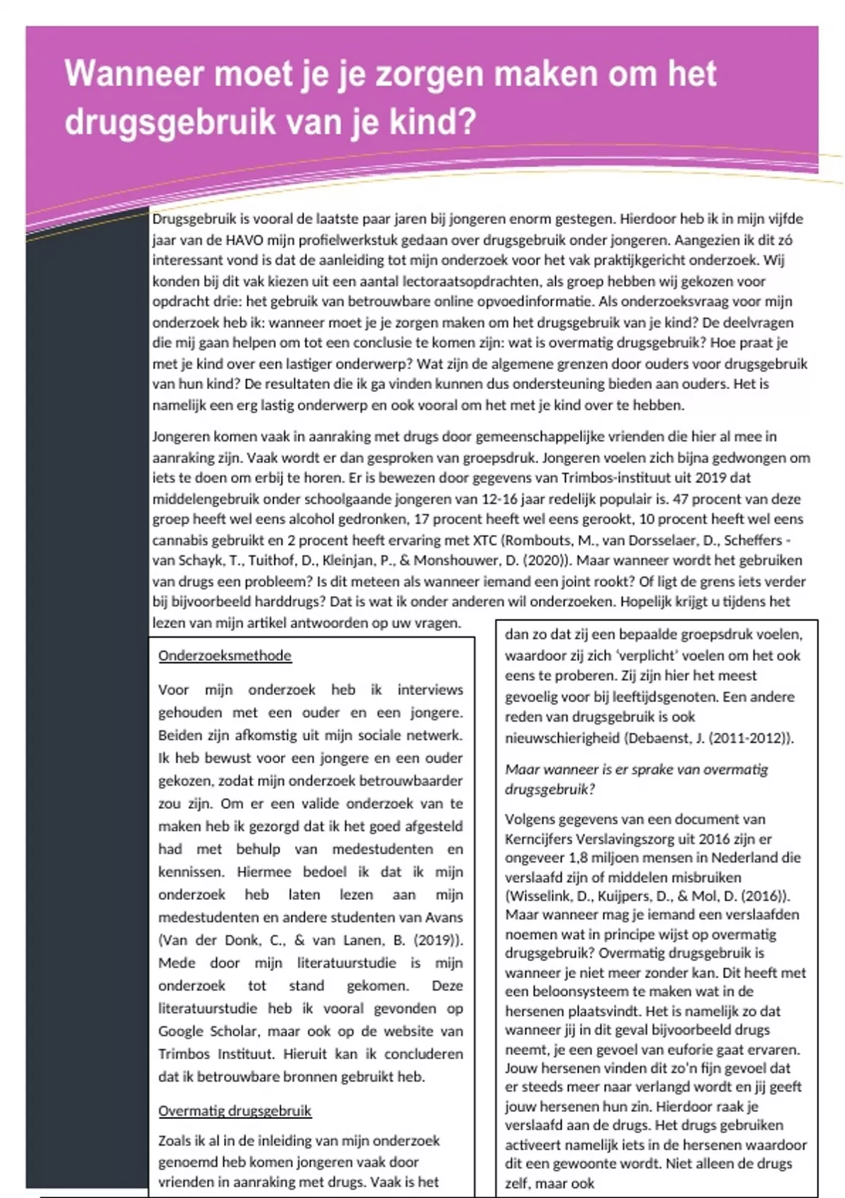 jaar van de HAVO mijn profielwerkstuk gedaan over drugsgebruik onder jongeren. Aangezien ik dit zó