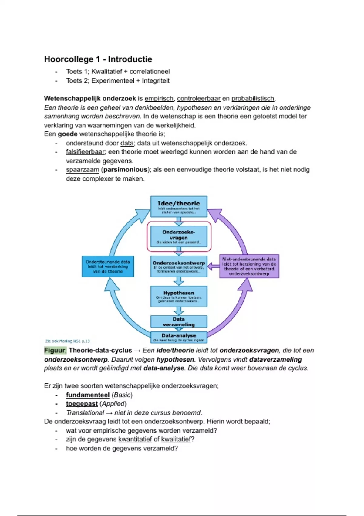 Figuur; Theorie-data-cyclus → Een idee/theorie leidt tot onderzoeksvragen, die tot een