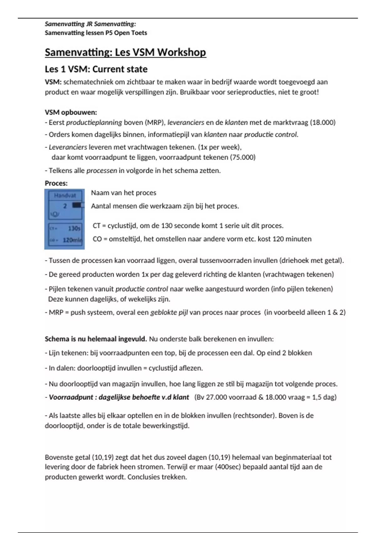 - Tussen de processen kan voorraad liggen, overal tussenvoorraden invullen (driehoek met getal).