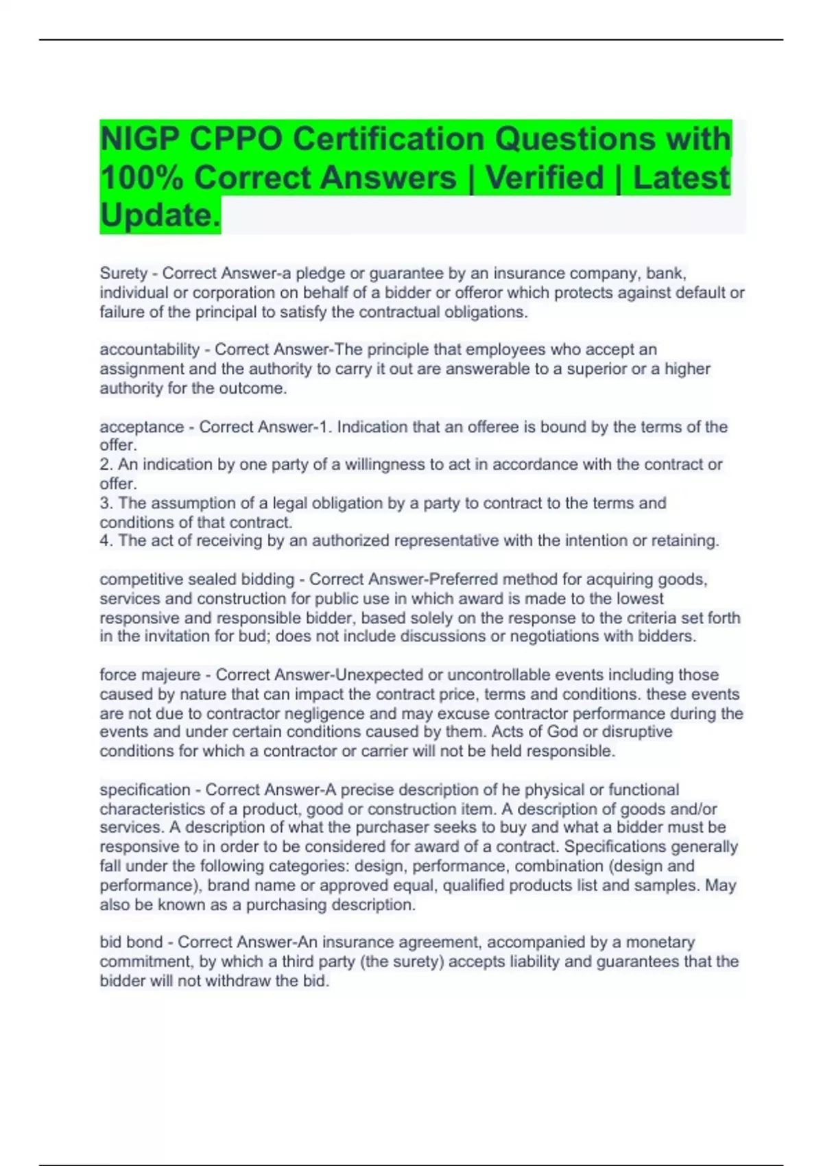 NIGP CPPO Certification Questions with 100% Correct Answers | Verified | Latest Update. Surety a pledge or guarantee by an insurance company, bank, individual or corporation on behalf of a bidder or offeror which protects against default or failure of the principal to satisfy the contractual obligations. accountability The principle that employees who accept an assignment and the authority to carry it out are answerable to a superior or a higher authority for the outcome. acceptance 1. Indication that an offeree is bound by the terms of the offer. 2. An indication by one party of a willingness to act in accordance with the contract or offer. 3. The assumption of a legal obligation by a party to contract to the terms and conditions of that contract. 4. The act of receiving by an authorized representative with the intention or retaining. competitive sealed bidding Preferred method for acquiring goods, services and construction for public use in which award is made to the lowest responsive and responsible bidder, based solely on the response to the criteria set forth in the invitation for bud; does not include discussions or negotiations with bidders. force majeure Unexpected or uncontrollable events including those caused by nature that can impact the contract price, terms and conditions. these events are not due to contractor negligence and may excuse contractor performance during the events and under certain conditions caused by them. Acts of God or disruptive conditions for which a contractor or carrier will not be held responsible. specification A precise description of he physical or functional characteristics of a product, good or construction item. A description of goods and/or services. A description of what the purchaser seeks to buy and what a bidder must be responsive to in order to be considered for award of a contract. Specifications generally fall under the following categories: design, performance, combination (design and performance), brand name or approved equal, qualified products list and samples. May also be known as a purchasing description. bid bond An insurance agreement, accompanied by a monetary commitment, by which a third party (the surety) accepts liability and guarantees that the bidder will not withdraw the bid. warranty A promise made by a seller to a buyer that is legally enforceable. The promise may be expressed or implied and is legally binding. best practice A business process, activity or operation that is considered outstanding, innovative or exceptionally creative by a recognized peer group. It may be considered as a leading-edge activity that has been successfully adopted or implemented and has brought efficiency and effectiveness to an organization. It may result in improved productivity, quality, reduced costs and increased customer service. return on investment or ROI A calculation used in business to determine whether a proposed investment is a wise business decision and how well it will repay the investor. It is calculated as the ratio of the amount gained or loss relative to the basis. The analysis takes the form of a dynamic model or statistical model. estoppel A legal principal that prevents a person from asserting a position that is inconsistent with his or her prior conduct, if injustice would thereby result to a person who has changed position in justifiable reliance upon that conduct. For example, a landlord informs a tenant that there was construction or a lapse in utility services. If the tenant relies on this statement in choosing to remain on the premises, the landlord could be barred under the principle from collecting full rent. performance based contract A results-oriented contracting method that focuses on the outputs, quality or outcomes that may tie at least a portion of a contractor's payment, contractor extensions, or contract renewals to the achievement of specific, measurable performance standards and requirements. These contract may include monetary and non-monetary incentives as well as specific remedies. fiduciary duty An individual's obligation to serve the best interests of selected stakeholders, especially those of their employer. sampling A technique used to avoid examination of each item in a population, yet will still be able to determine whether the entire population shall be accepted as complying with the acceptable quality level or stated requirements. value analysis An organized effort directed at analyzing the functions of a product or service including specifications, standards, practices, and procedures with intent to satisfy the required function at the lowest possible cost without impacting functional need and suitability. drayage A charge for hauling something between various locations by a transportation company. income statement A financial report that shows an organization's profitability over a period of time - months, quarter, or year.