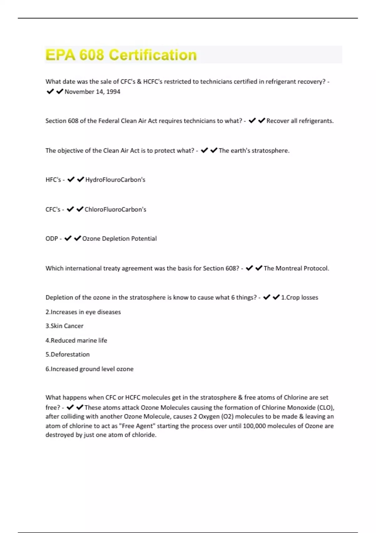 What date was the sale of CFC's & HCFC's restricted to technicians certified in refrigerant recovery? - November 14, 1994 Section 608 of the Federal Clean Air Act requires technicians to what? - Recover all refrigerants. The objective of the Clean Air Act is to protect what? - The earth's stratosphere. HFC's - HydroFlouroCarbon's CFC's - ChloroFluoroCarbon's ODP - Ozone Depletion Potential Which international treaty agreement was the basis for Section 608? - The Montreal Protocol. Depletion of the ozone in the stratosphere is know to cause what 6 things? - 1.Crop losses 2.Increases in eye diseases 3.Skin Cancer 4.Reduced marine life 5.Deforestation 6.Increased ground level ozone What happens when CFC or HCFC molecules get in the stratosphere & free atoms of Chlorine are set free? - These atoms attack Ozone Molecules causing the formation of Chlorine Monoxide (CLO), after colliding with another Ozone Molecule, causes 2 Oxygen (O2) molecules to be made & leaving an atom of chlorine to act as "Free Agent" starting the process over until 100,000 molecules of Ozone are destroyed by just one atom of chloride.What date was recovery equipment required to be certified by a lab, & achieve higher evacuation levels, & have low loss fittings? - November 15, 1993 On what date was technician certification required? - November 14, 1994 What date was CFC's phased out of production? - December 31, 1995 What is EPA 608 Type I certification? - Persons who maintain, service, repair, or dispose of small appliances (containing 5 pounds of refrigerant (or less).