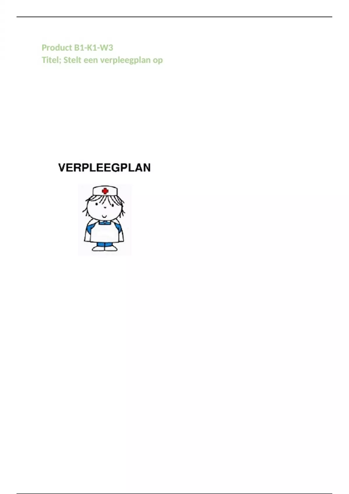 Examen A. Product B1-K1-W3 Titel; Stelt een verpleegplan op Het verpleegplan. Beoordeeld met een 'Voldoende'.