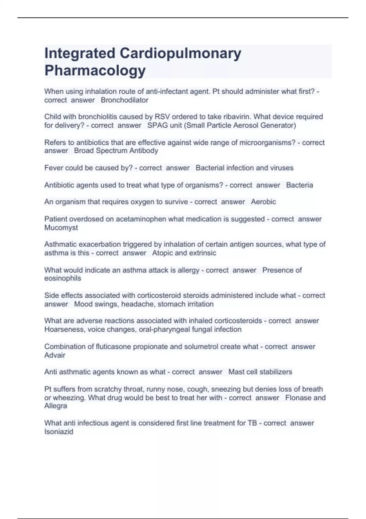 Integrated Cardiopulmonary Pharmacology Question and answers rated A+ 2023